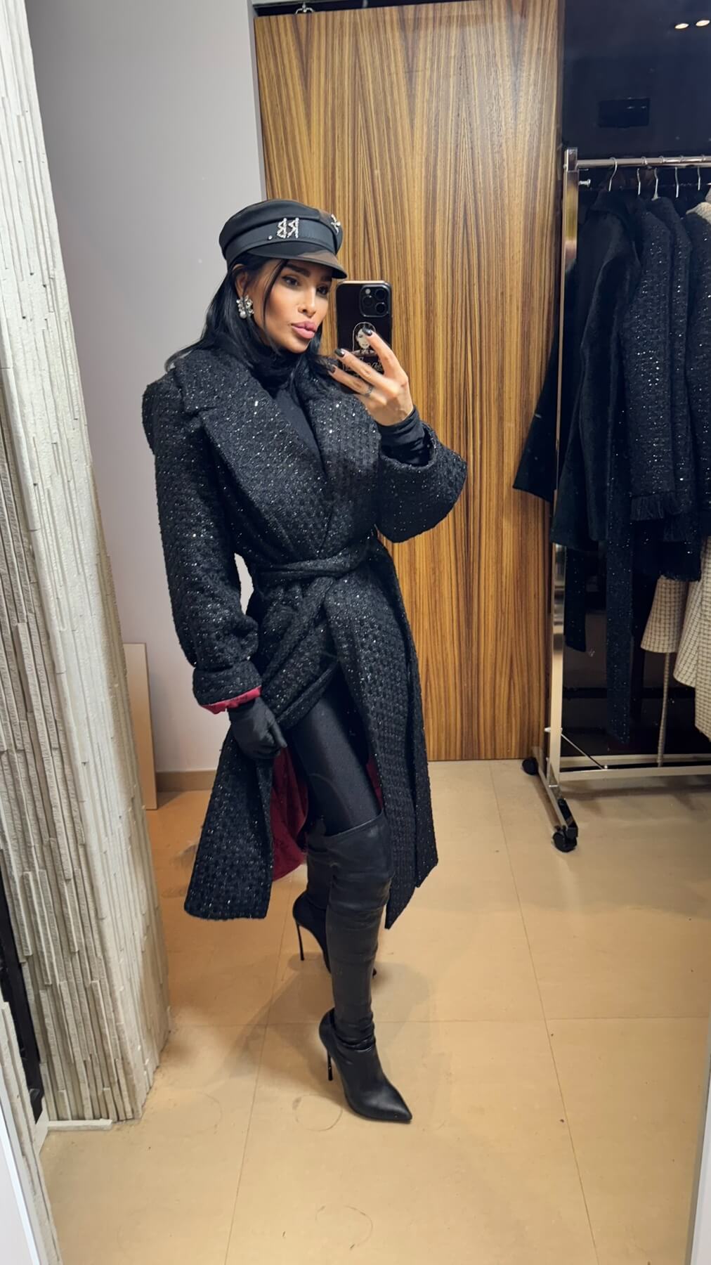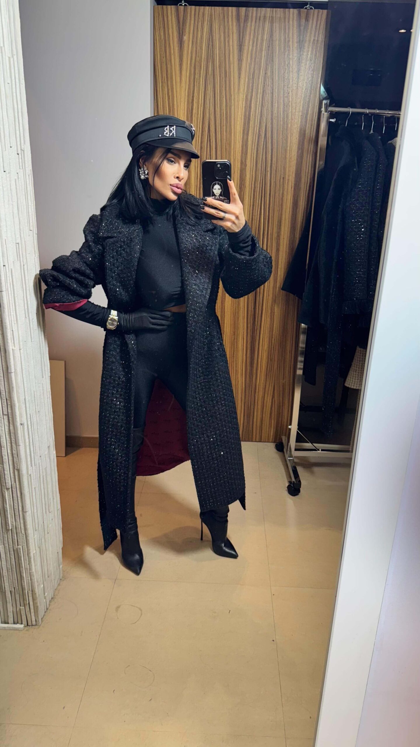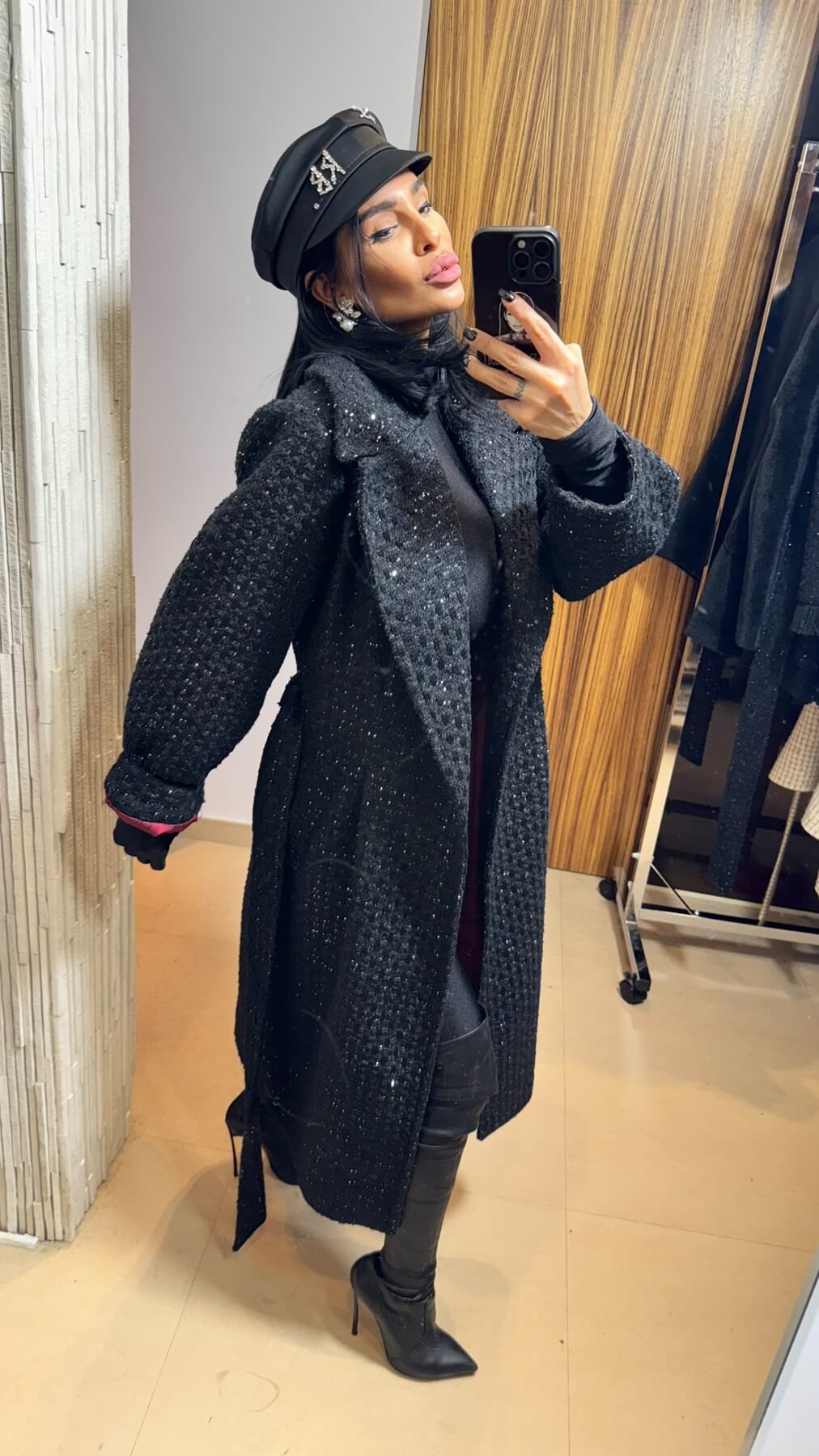 Bouclé Noir е въплъщение на безвременната елегантност – изключително дълго палто от висококачествен букле материал с фина структура и деликатен блясък. Този завладяващ модел съчетава класическата sophistication с модерни дизайнерски акценти, създавайки визия на абсолютна власт и непреходен стил.