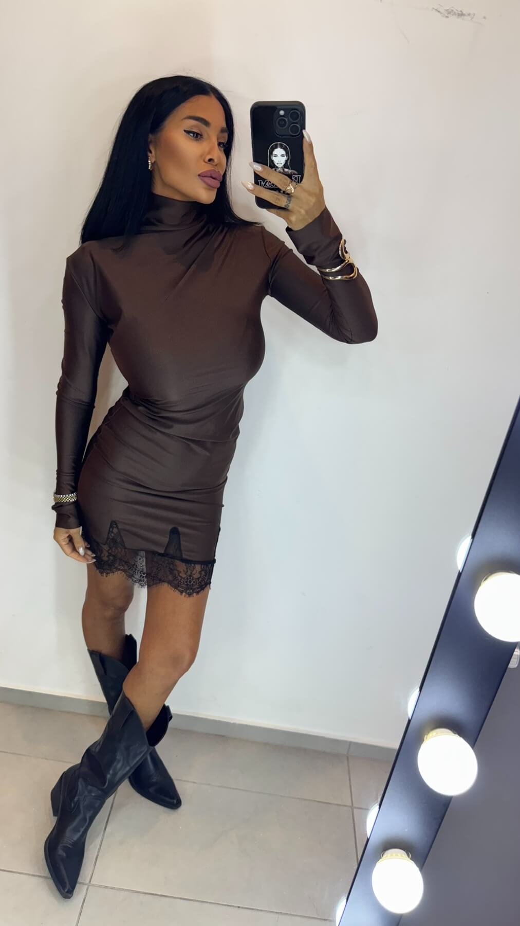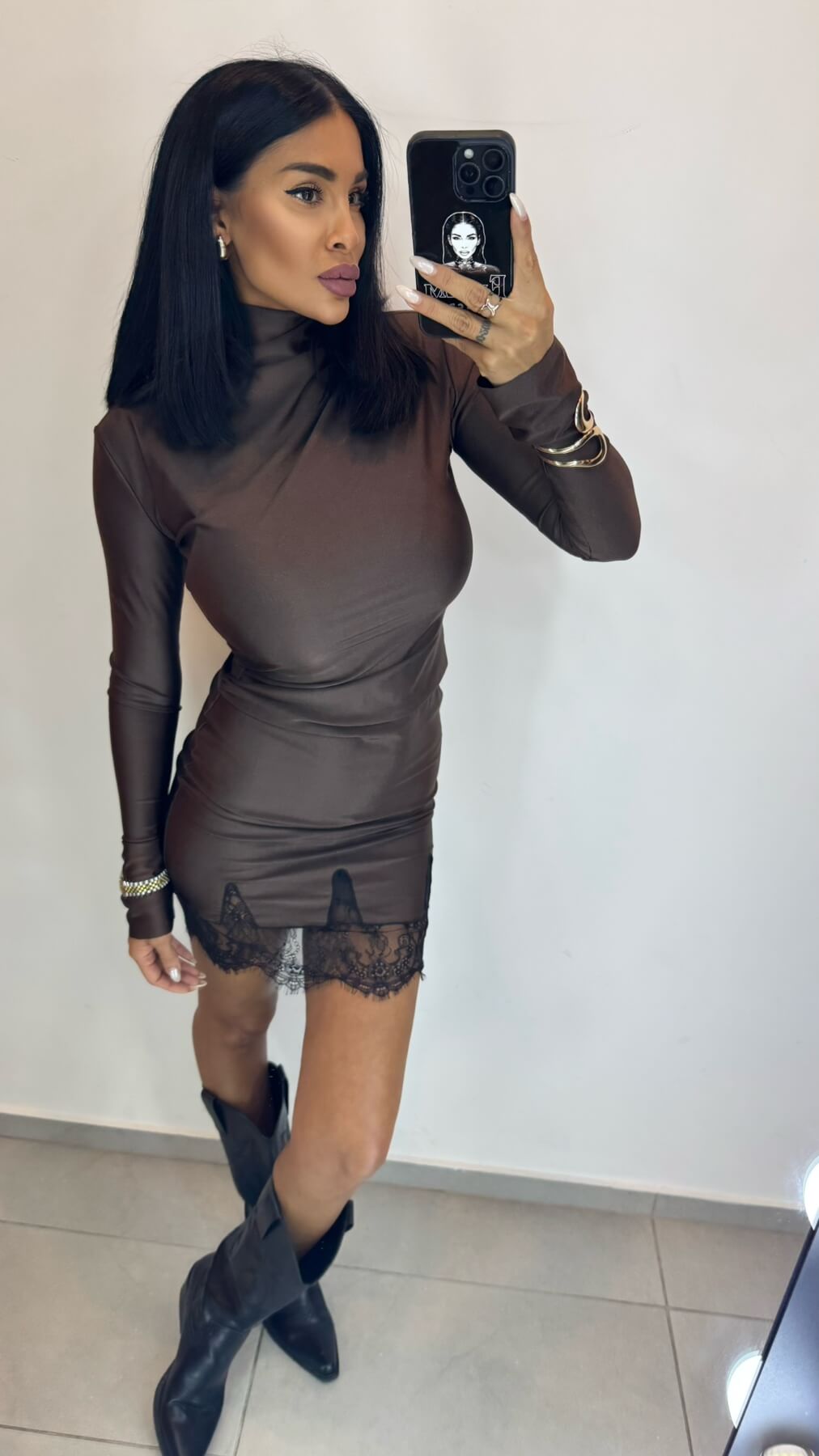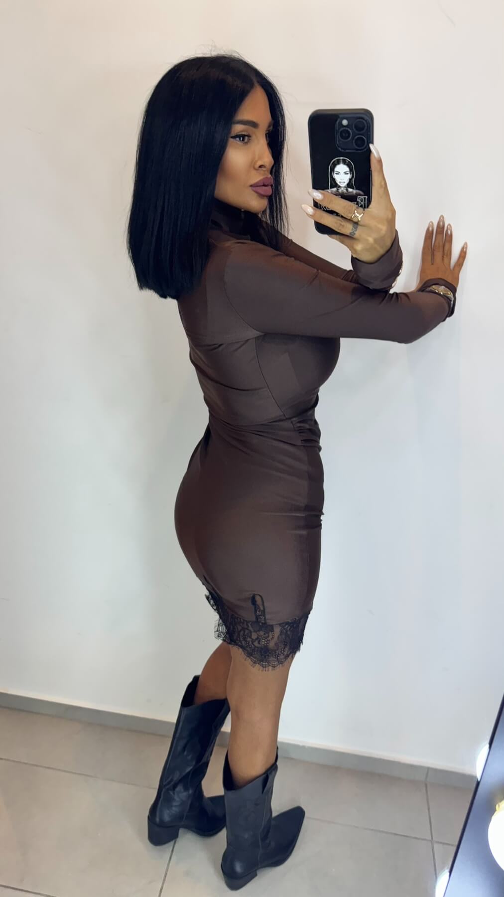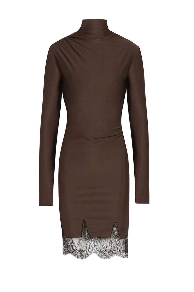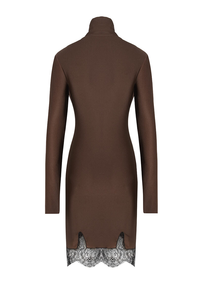 Chocolate Dream Рокля е символ на изискания стил и съвременната женственост – елегантна рокля от ликра в богат шоколадов цвят с вградени дантелени детайли. Този завладяващ модел съчетава комфорта на еластичния материал с изтънчеността на дантелените акценти.