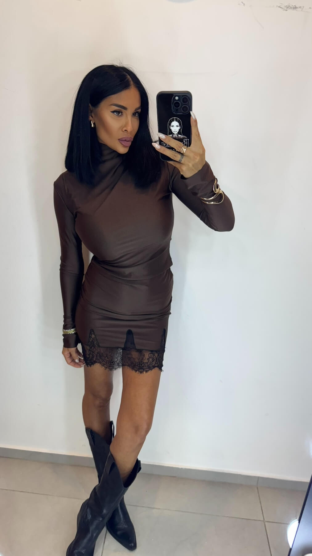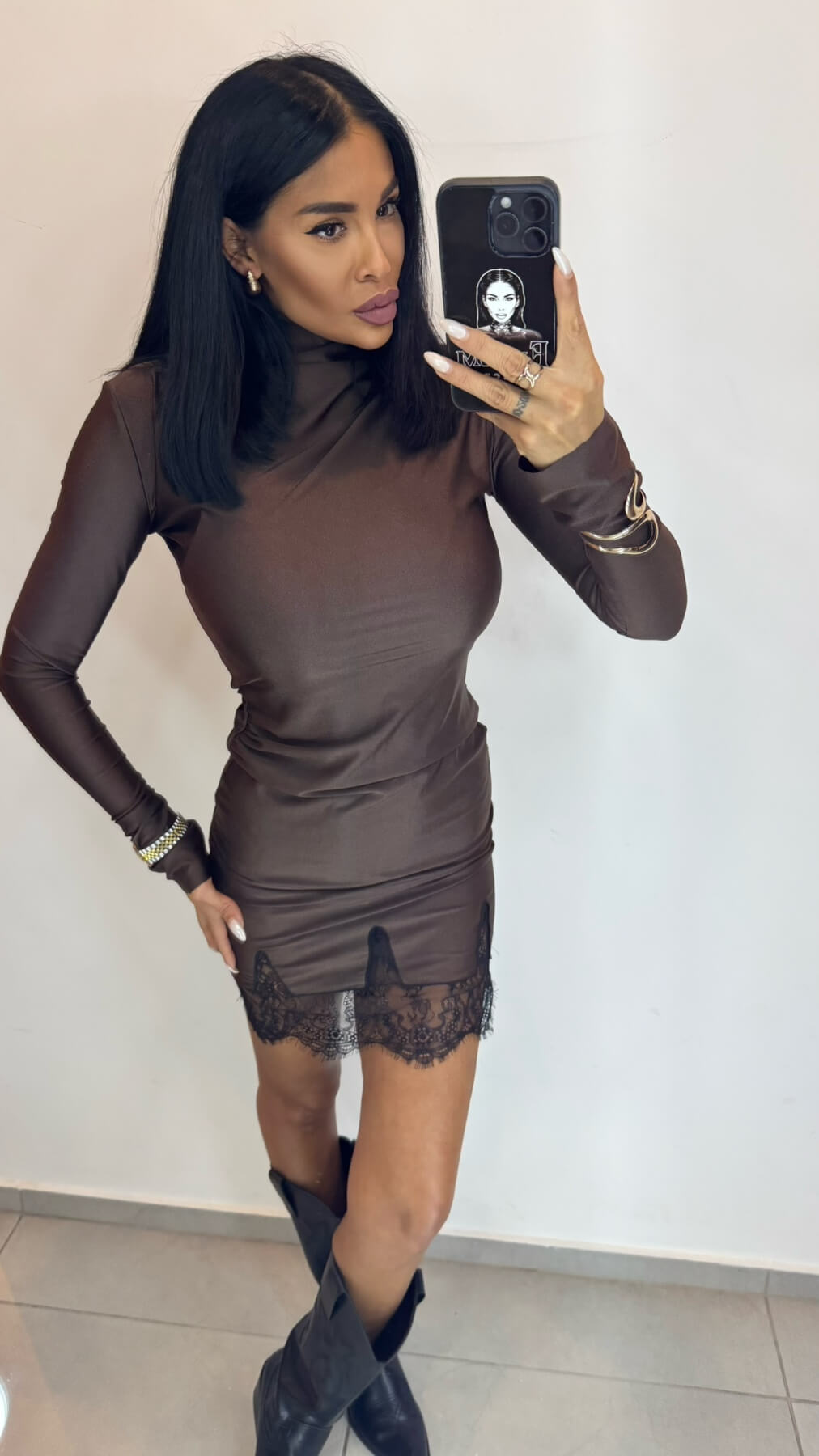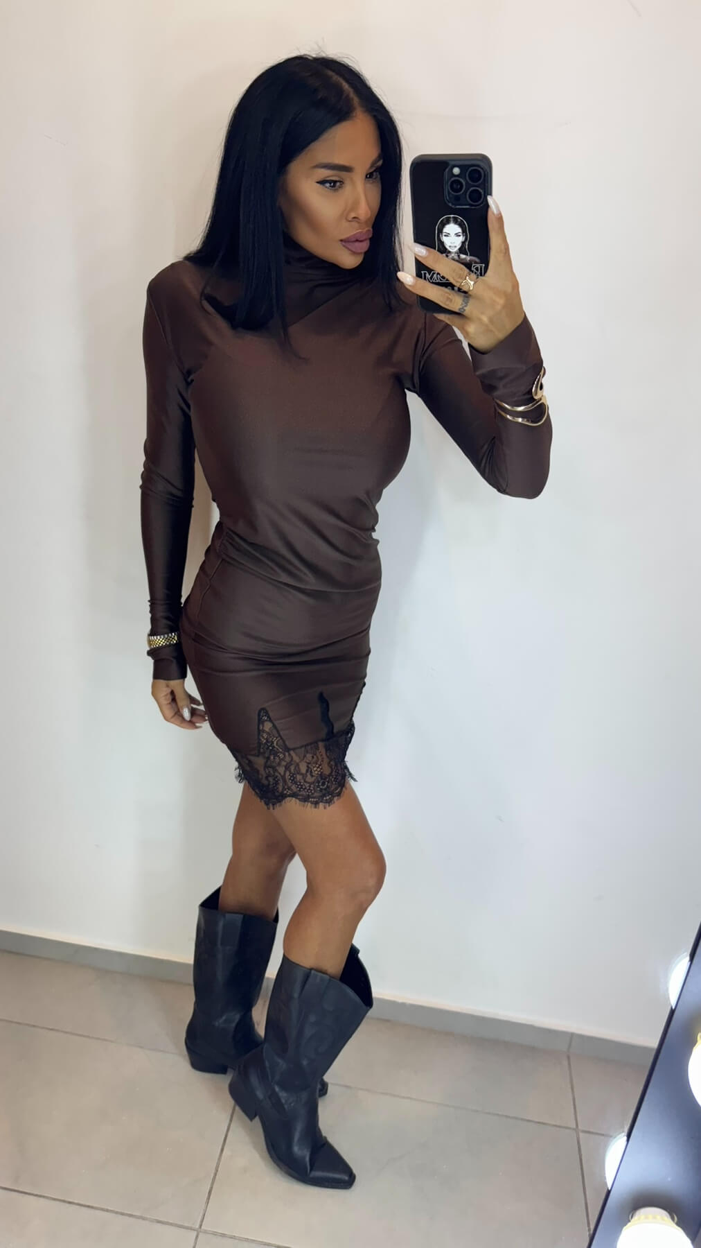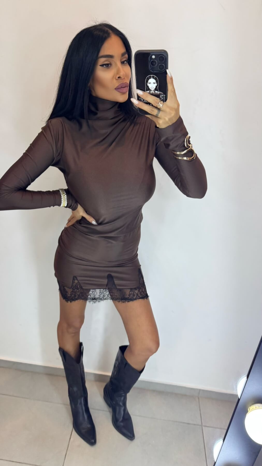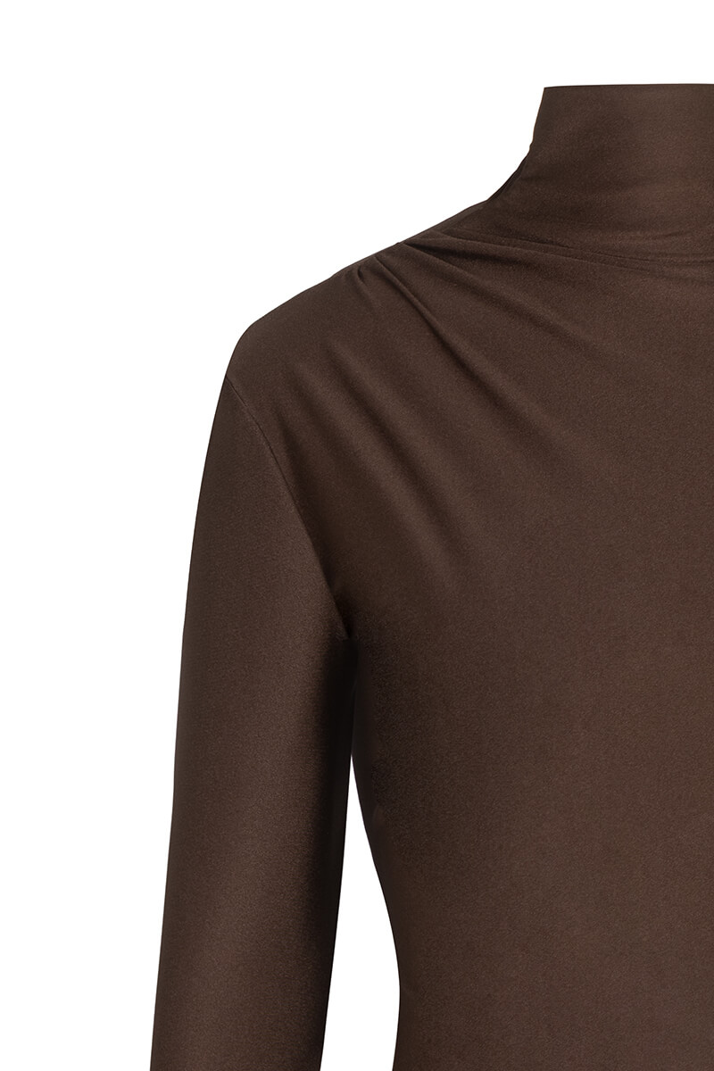 Високата поло яка създава модерна и стилна рамка, докато fitted силуетът подчертава женствените форми. Дългите ръкави осигуряват елегантно покритие, а вградената дантела по подгъва добавя романтичен завършек към минималистичния дизайн.
