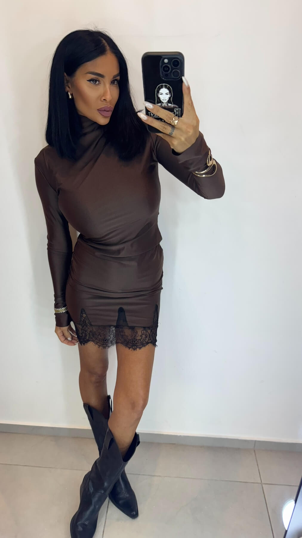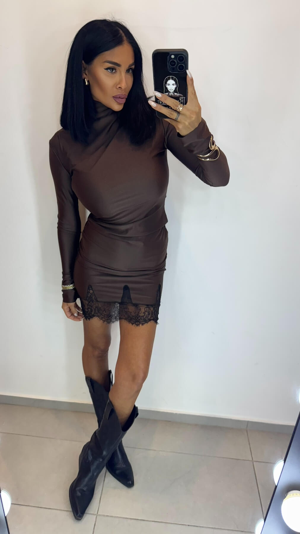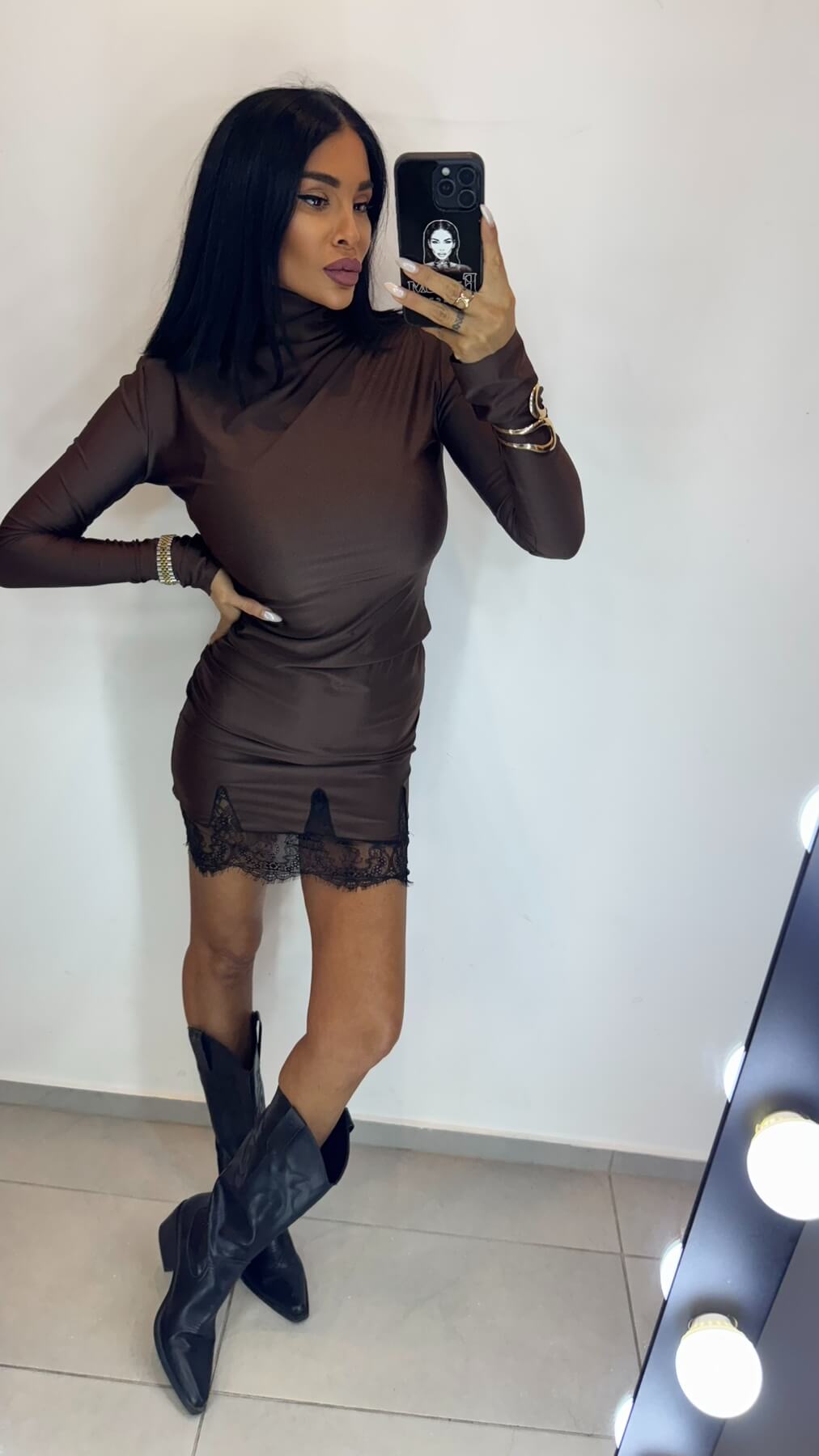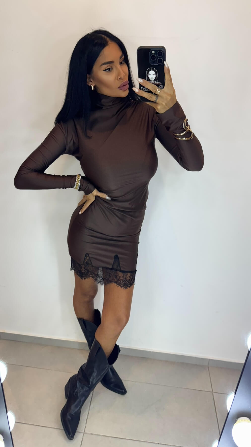 Високата поло яка създава модерна и стилна рамка, докато fitted силуетът подчертава женствените форми. Дългите ръкави осигуряват елегантно покритие, а вградената дантела по подгъва добавя романтичен завършек към минималистичния дизайн.