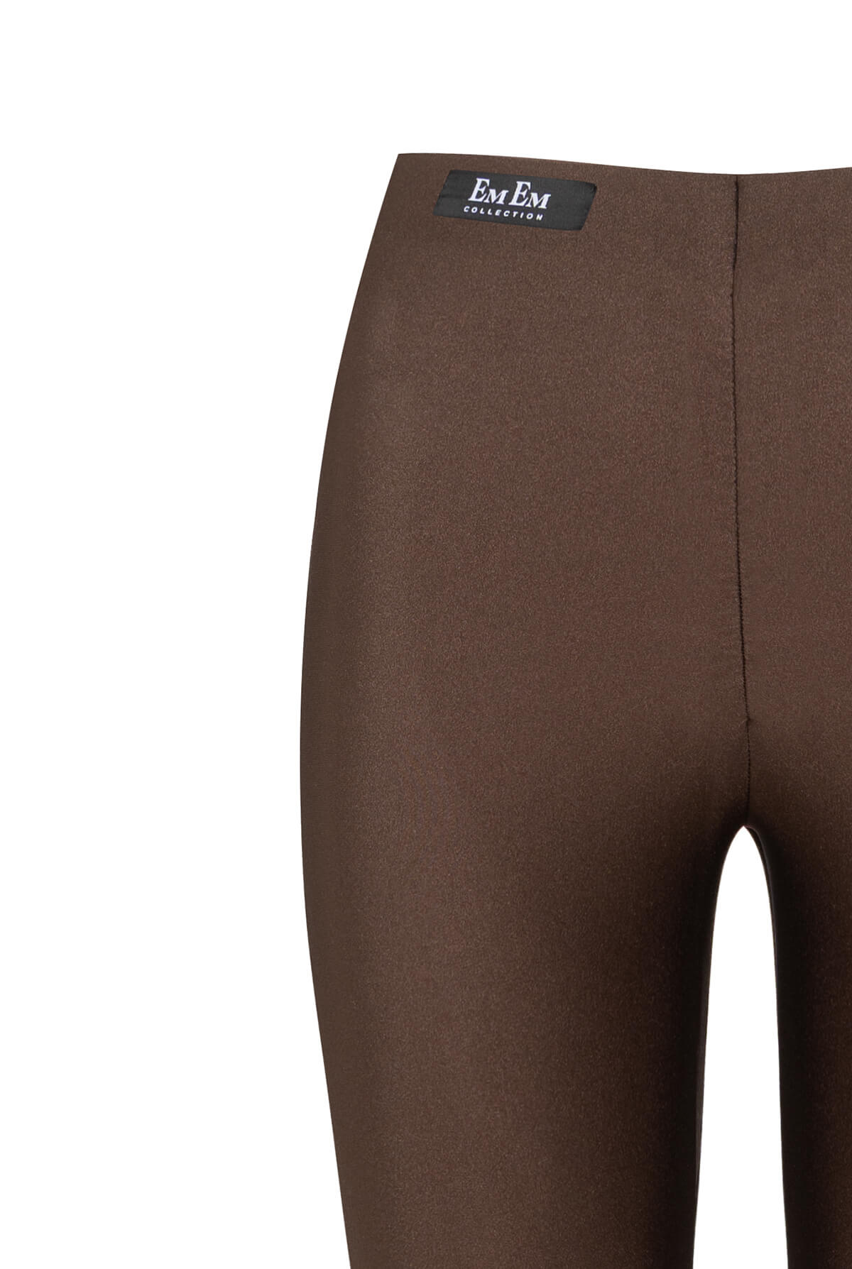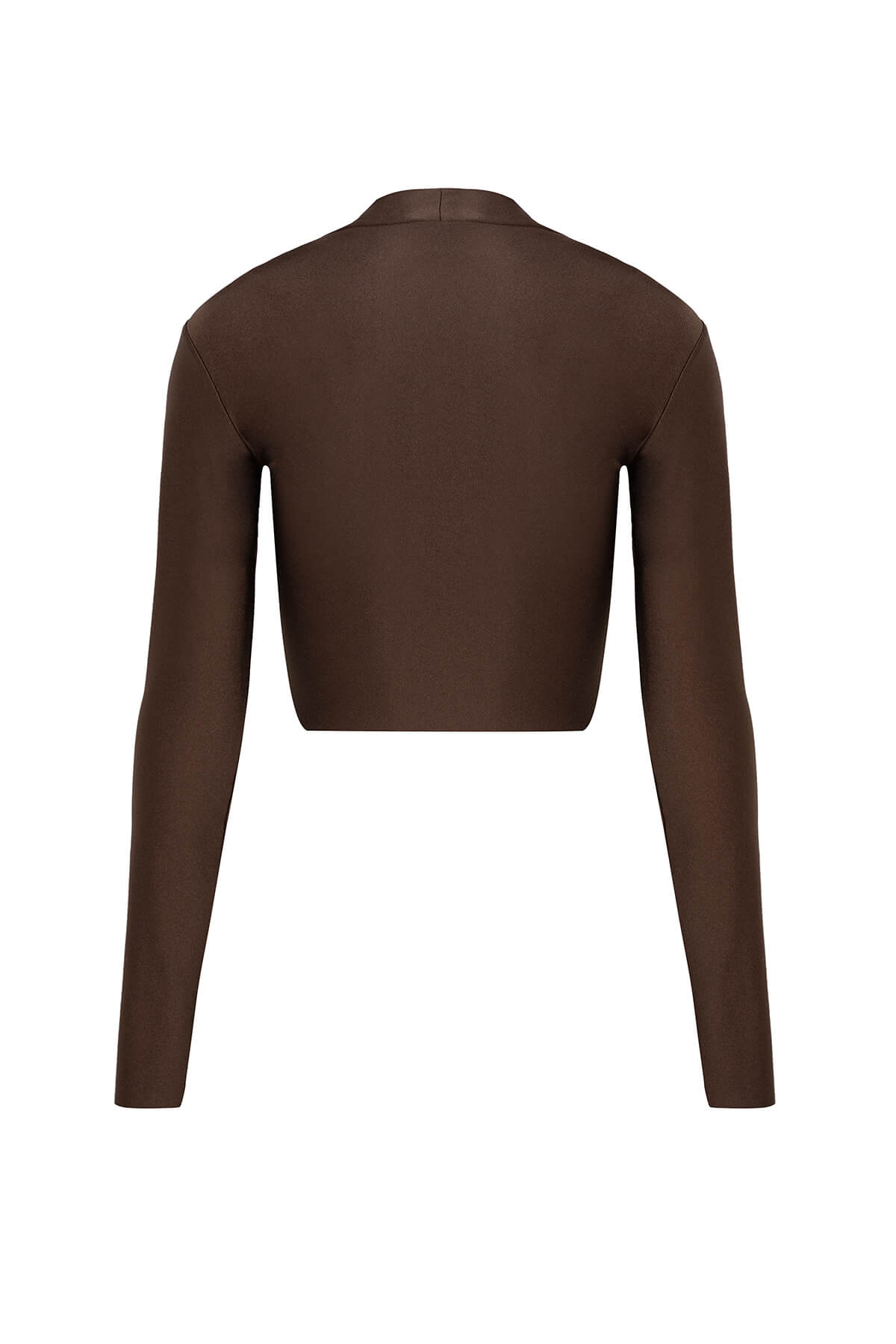 Chocolate Power Set е въплъщение на спортната елегантност и женствената сила – луксозен комплект от две части от висококачествена кафява ликра с деликатен блясък, който обгръща тялото с прецизност и подчертава силуета с безкомпромисна увереност. Този завладяващ модел доказва, че истинската власт започва от начина, по който носиш тялото си. Crop топът е централният акцент на комплекта – прилепналата кройка с висока яка тип полуполо и дълги ръкави създава елегантна основа, върху която централната вертикална ruched линия от яката до подгъва добавя визуална дълбочина и умело подчертава женствения силует. Деликатният V-образен cut-out в долната част на предницата внася провокативна нотка – изтънчена, но неустоима. Прилепналият клин с висока талия следва линията на тялото с математическа прецизност, докато характерният stirrup детайл – лентата под ходилото – добавя спортен, динамичен финал, вдъхновен от конния спорт и runway естетиката. Em Em Collection нашивката на талията поставя печата на изключителност.