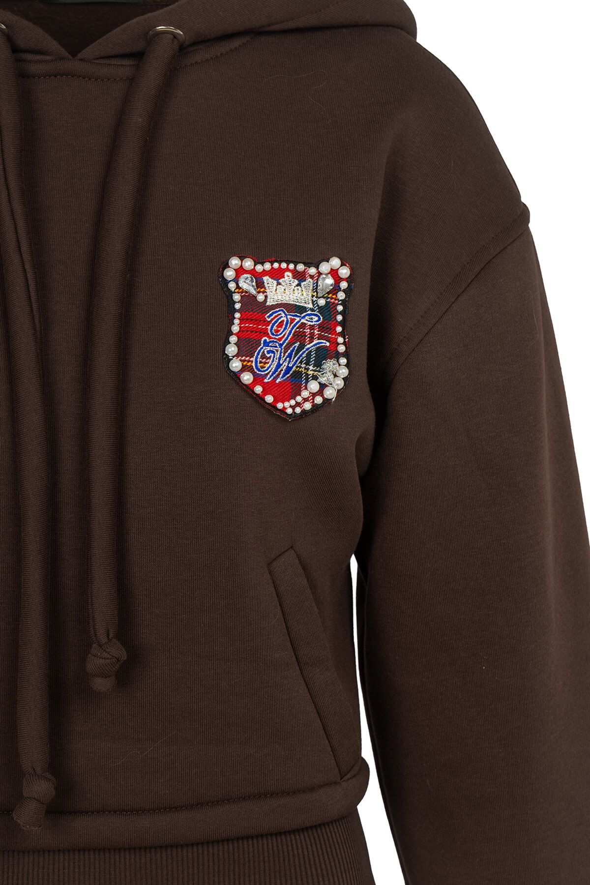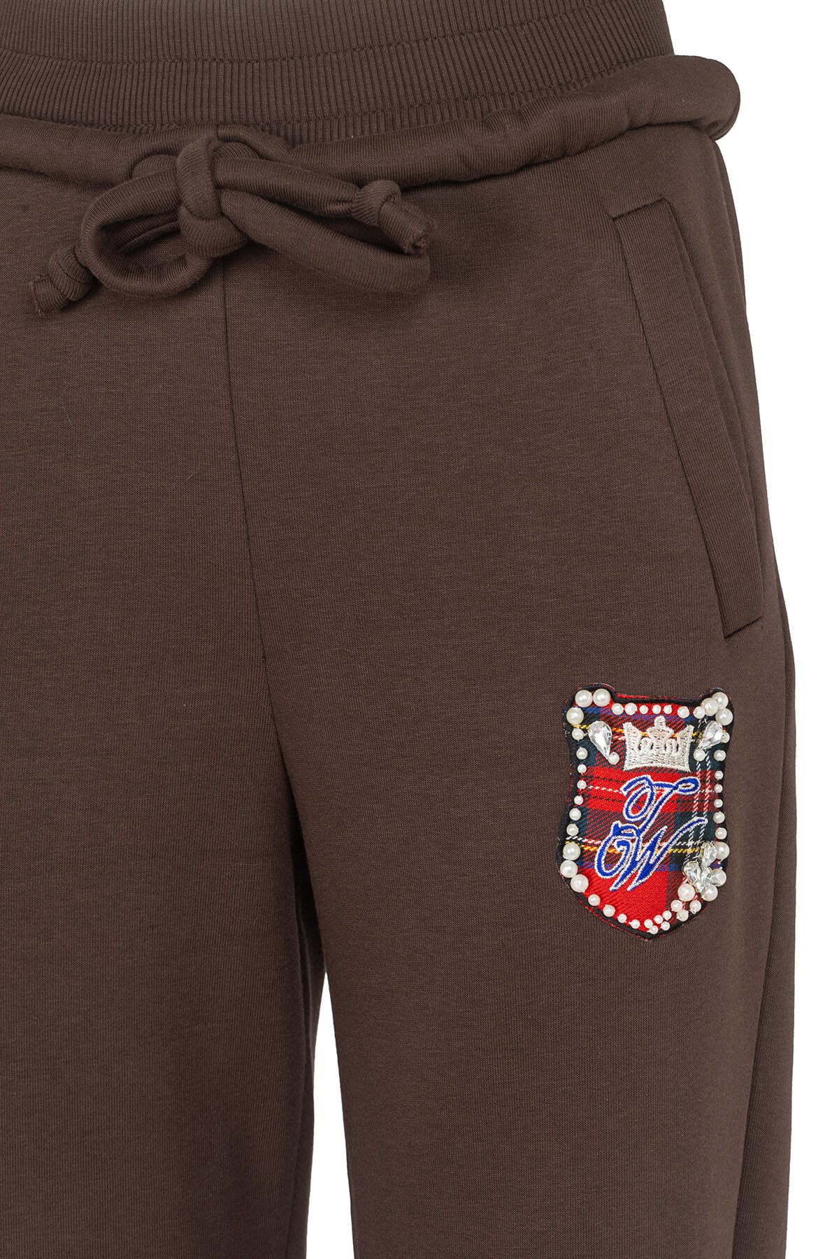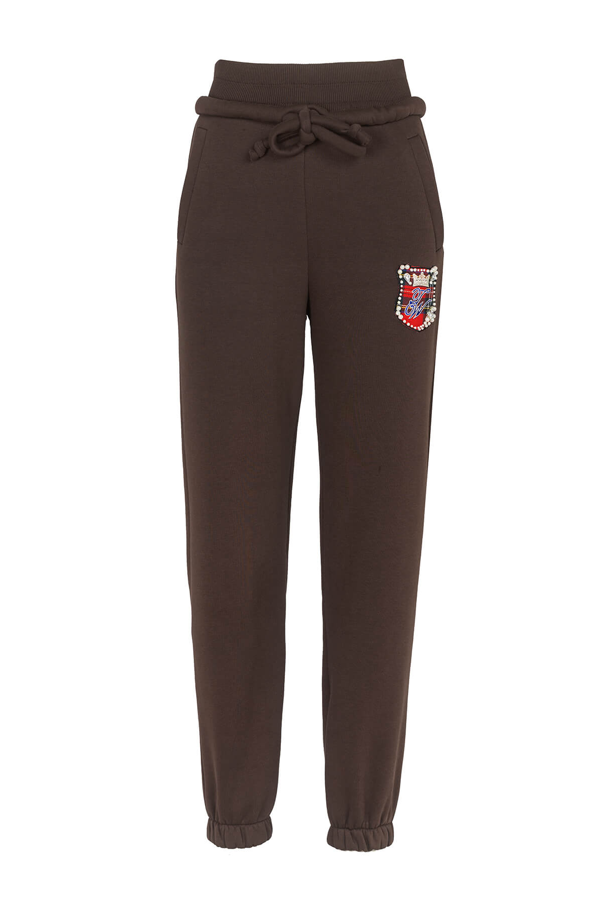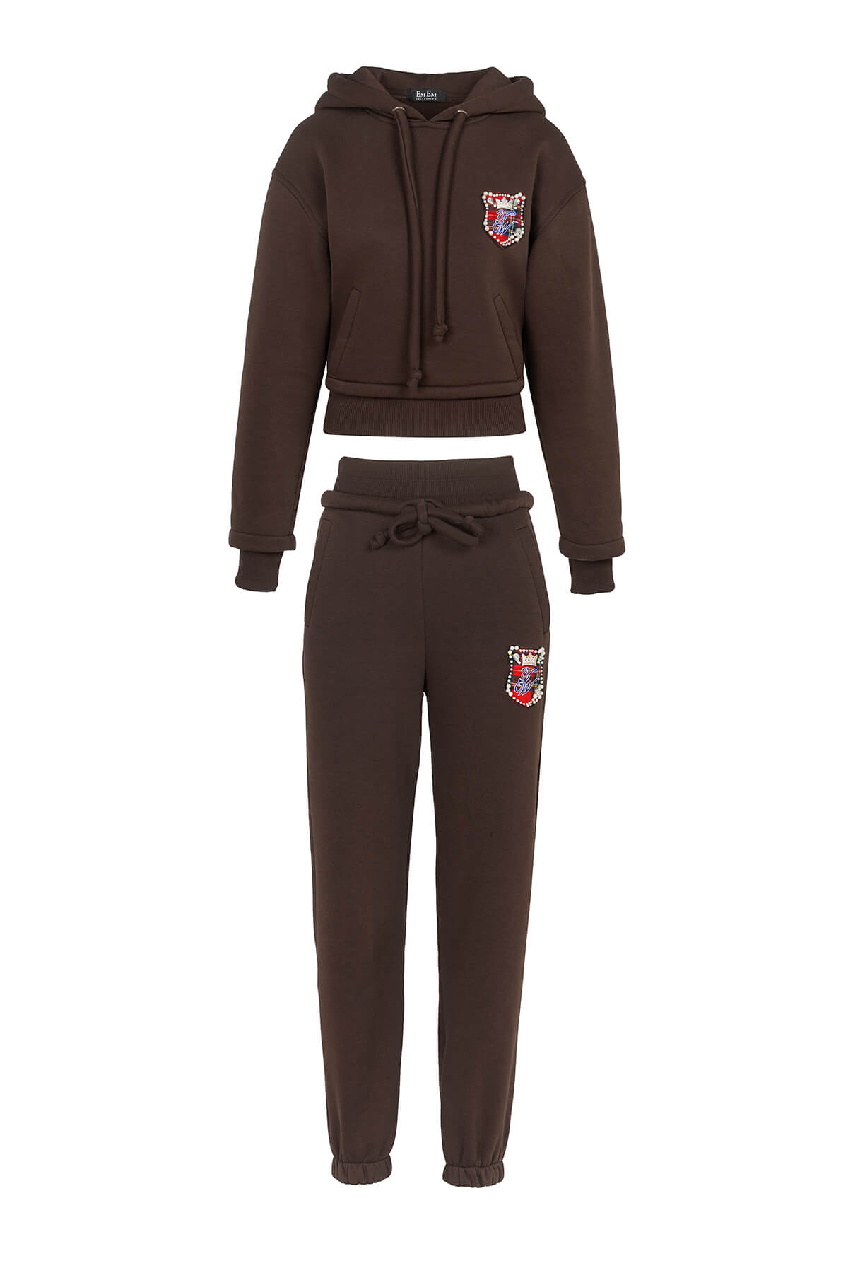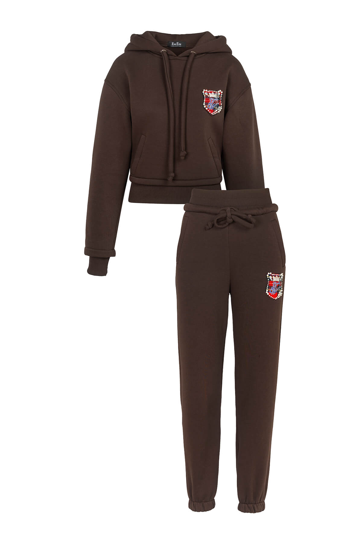 Конструкцията на модела е истинско произведение на внимание към детайла. Късата hoodie блуза с качулка и регулируеми връзки създава изтънчен силует, който подчертава талията с аристократична прецизност. Изключителната heraldic емблема с корона, декорирана с перли и кристали, привлича погледите като истински jewelry акцент и превръща спортния модел в луксозно statement парче. Практичният джоб добавя функционалност без да компрометира елегантността. Панталоните с регулируема талия и връзки завършват ансамбъла с благородна простота, а геральдичната емблема се появява отново като изтънчен детайл, който шепне за изключителност.