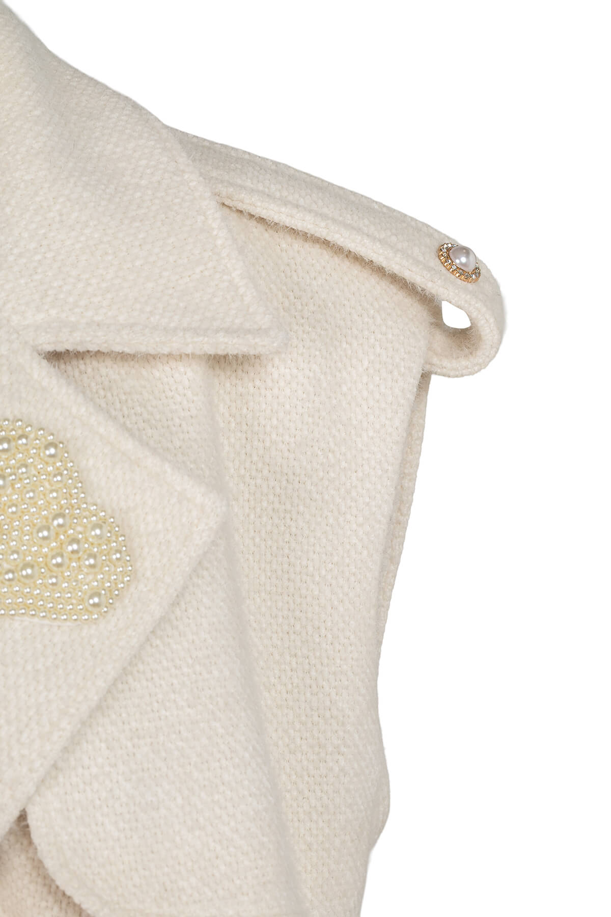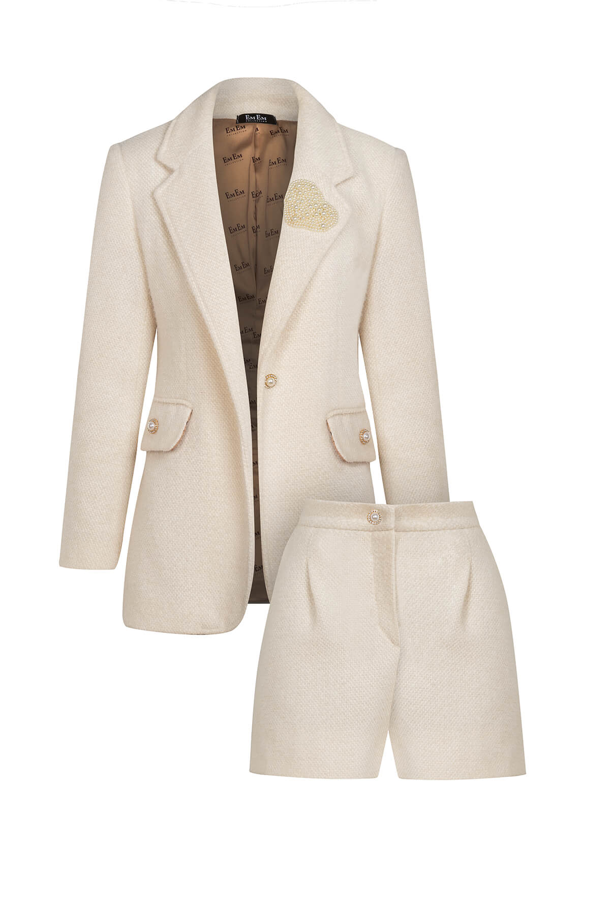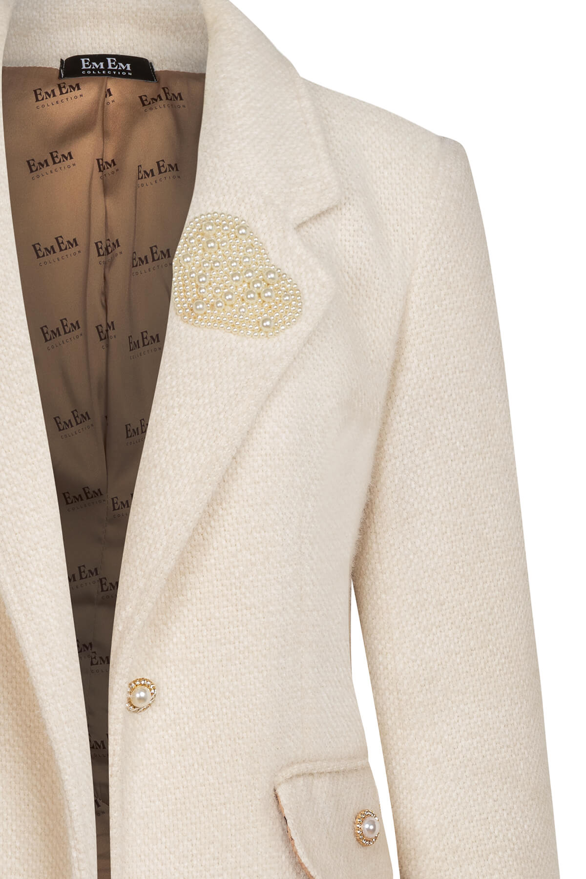 Конструкцията на сакото следва класическата линия с дълги ръкави и структуриран силует, който подчертава женствените форми без да отстъпва от своята строгост. Всеки детайл е внимателно обмислен – перлената сърцевидна брошка на лацкана добавя романтична нотка към иначе властния силует, докато три перлени копчета с кристална обкантовка на всеки маншет превръщат дори жеста на протегната ръка в елегантно изявление. Деликатният цепец на гърба гарантира свобода на движение с непреходна изисканост, а подплатата с Em Em Collection принт остава интимният знак за безупречно качество.
