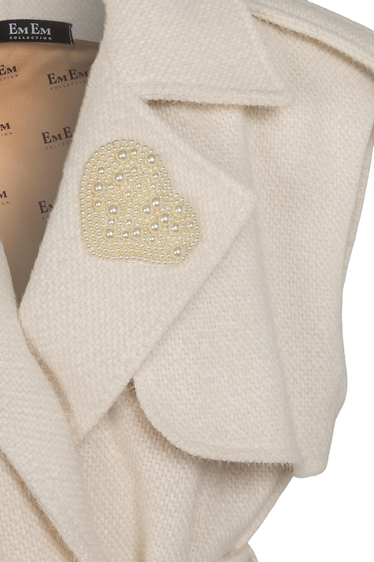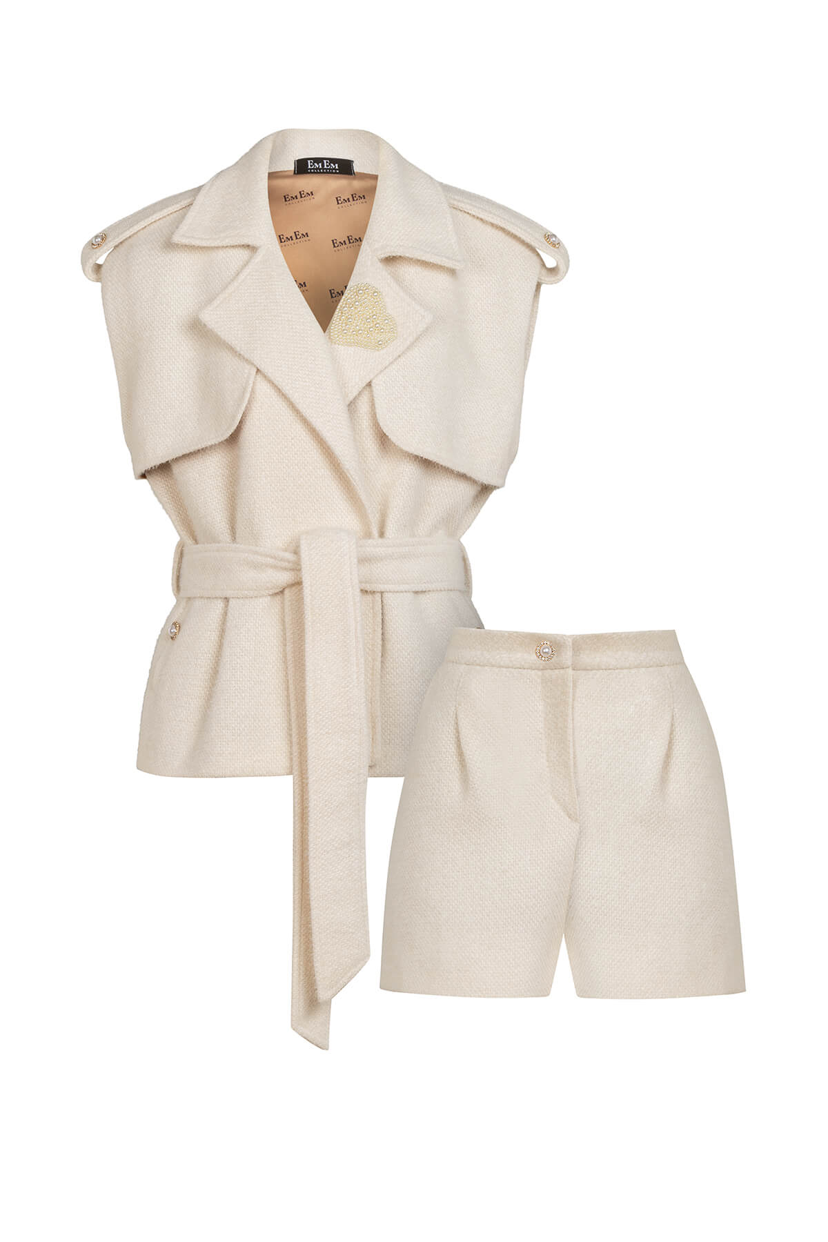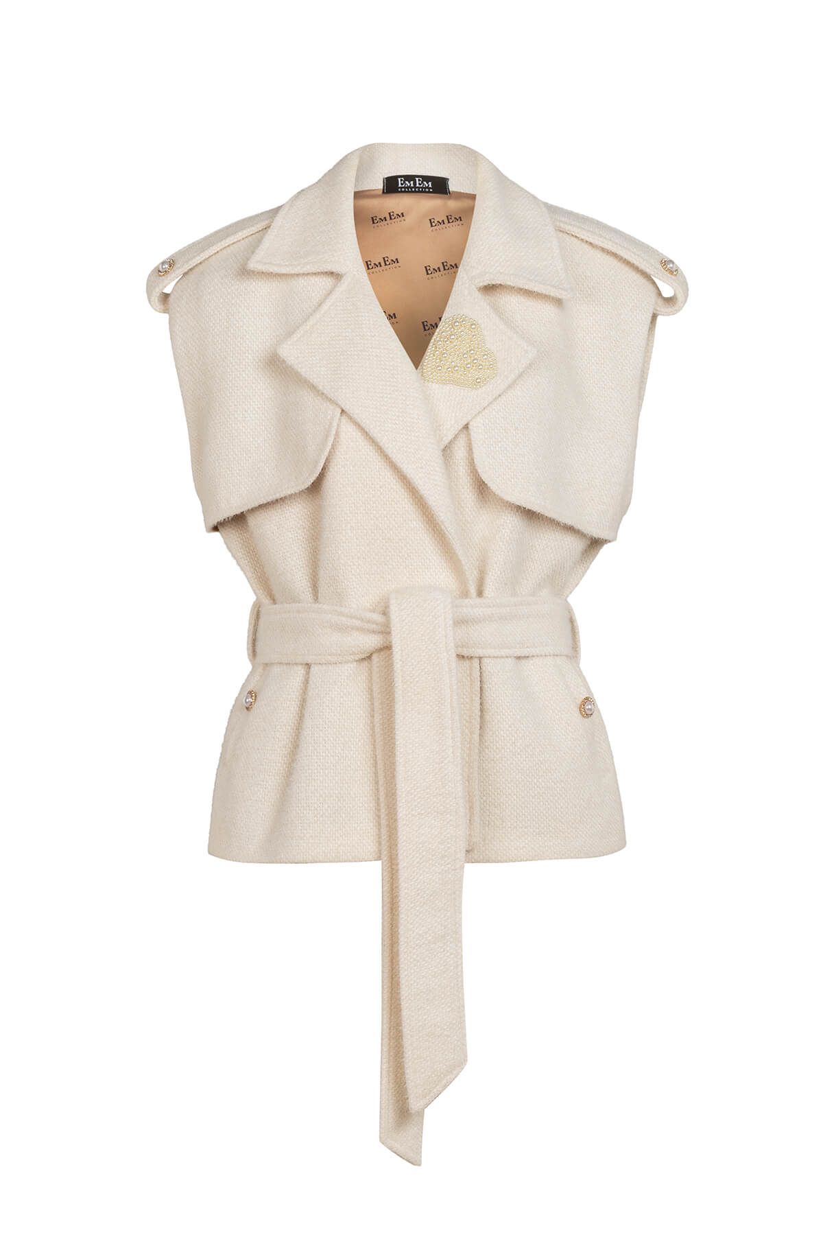 Конструкцията на елека е прецизна и обмислена – широките ревери тип trench придават структура и характер, докато регулируемият колан подчертава талията с елегантност и точност. Всеки детайл разказва история на изключителност: перлената сърцевидна брошка на лацкана е истинско бижутерско произведение, което привлича погледите към деколтето с деликатна провокация. Перлените копчета с кристална обкантовка на раменете и джобовете добавят онзи лъч луксозна светлина, който превръща всяка визия в изявление. Подплатата с Em Em Collection принт е финалният щрих – невидим знак за безупречното качество, предназначен само за тези, които знаят.