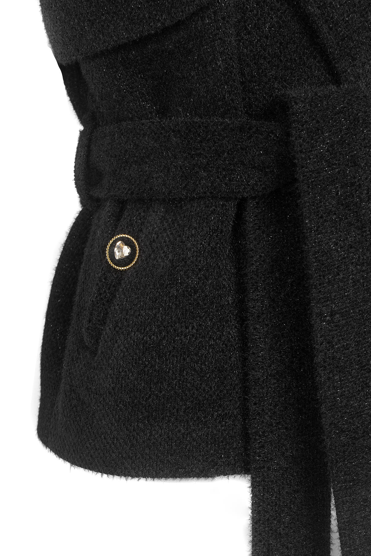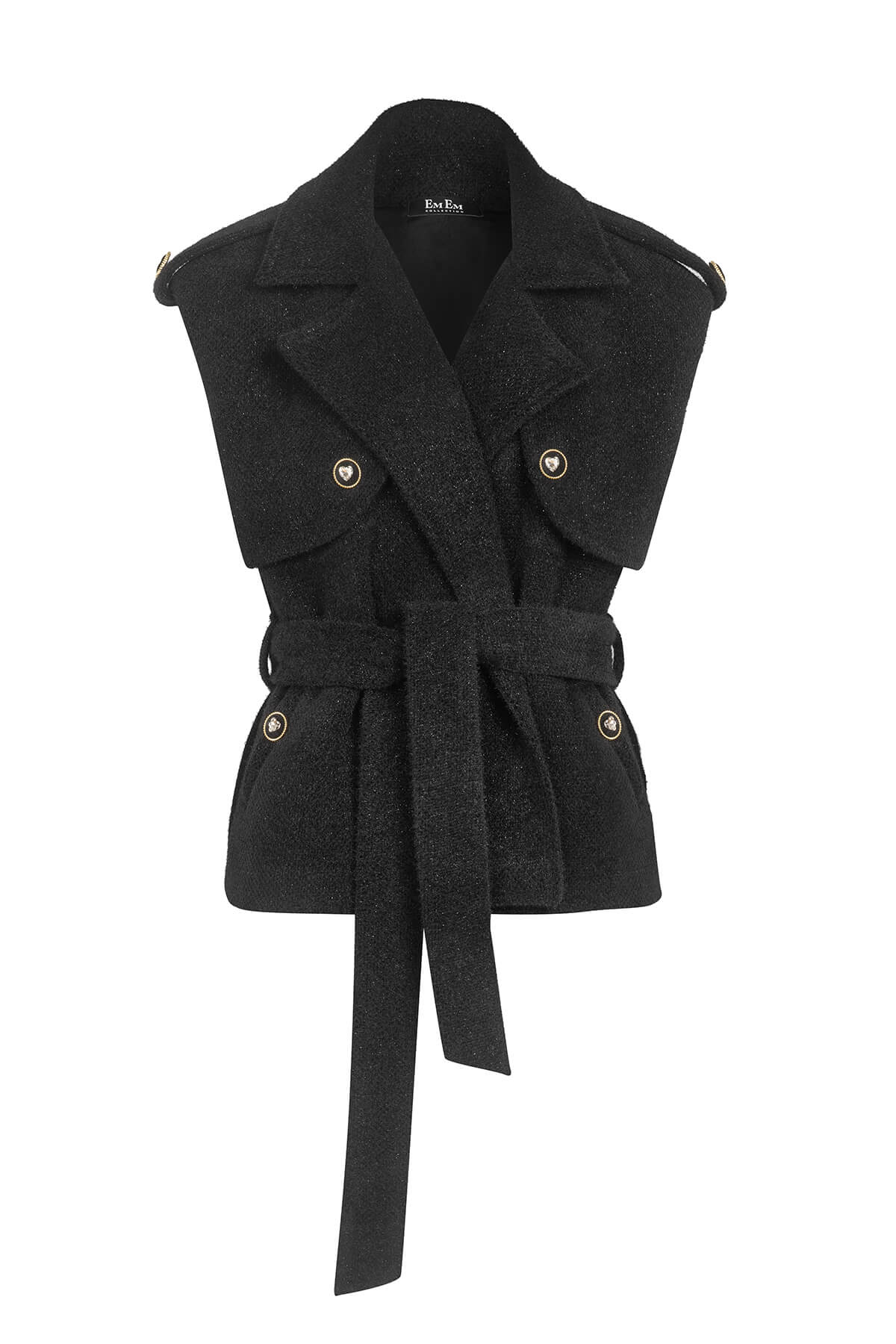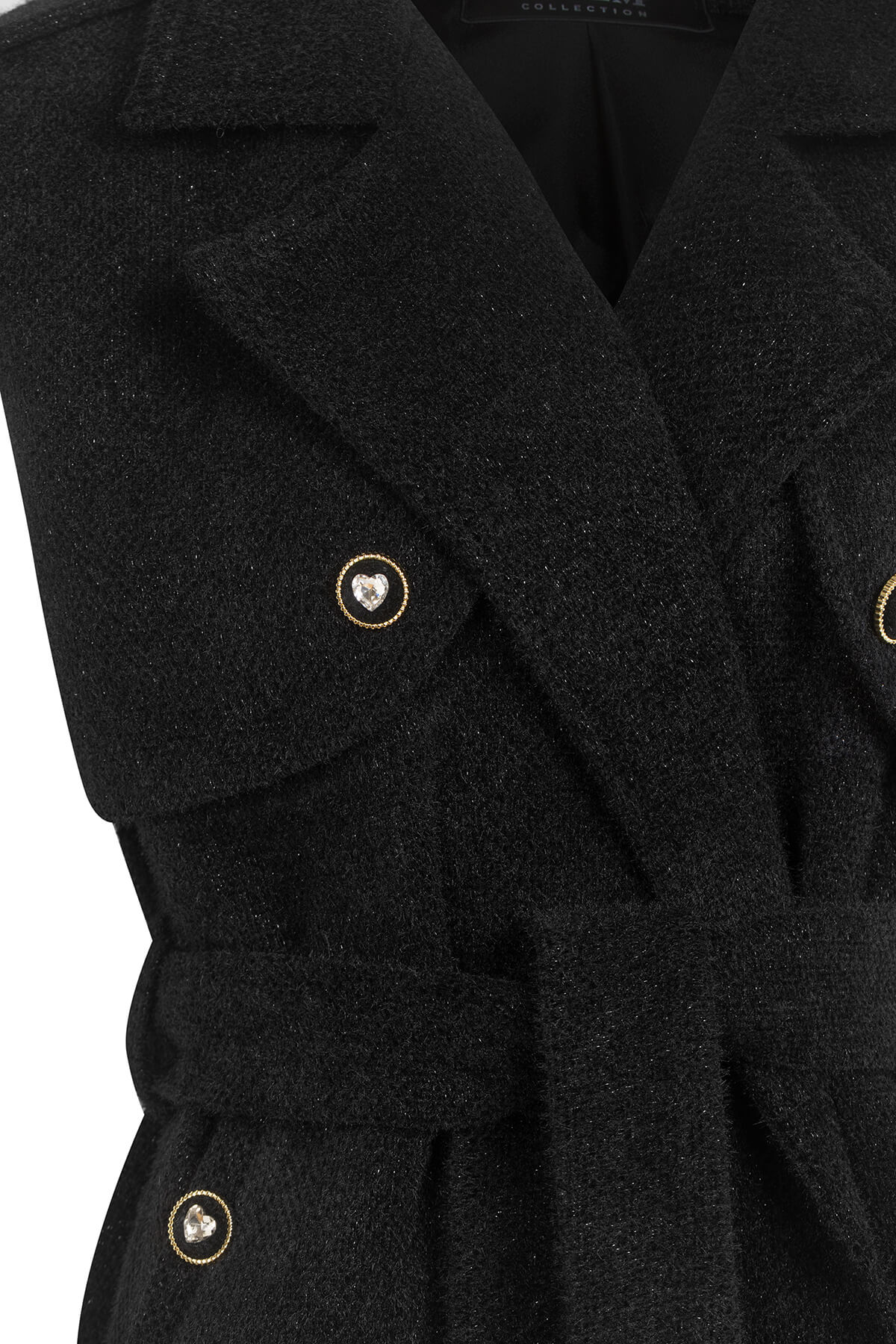 Конструкцията на елека е прецизна и обмислена – широките ревери тип trench придават структура и характер, докато регулируемият колан подчертава талията с безупречна точност. Златните копчета с кристално сърце на раменете и джобовете са онзи дръзък романтичен детайл, който разбива строгостта на черното с изненадваща нежност. Деликатният металик в тъканта улавя светлината при всяко движение, превръщайки елека в истинско изявление дори без думи.