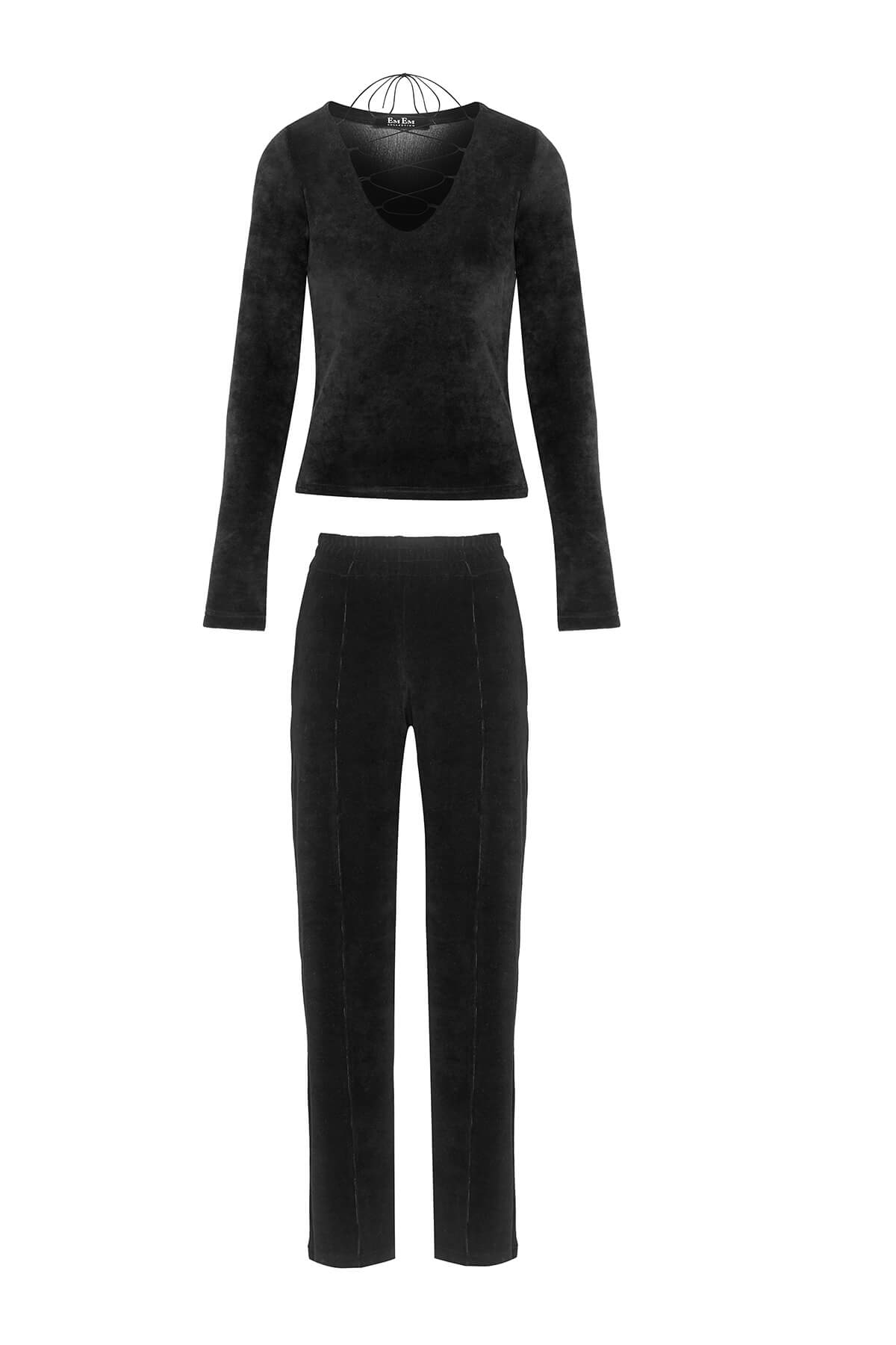 Конструкцията на модела е внимателно обмислена за перфектен баланс между елегантност и comfort. Топът с дълъг ръкав и V-образно деколте създава изтънчен силует, докато уникалният criss-cross lace-up детайл на гърдите добавя интригуващ акцент и subtle sensuality. Този детайл привлича погледите и добавя unexpected twist към иначе минималистичния дизайн. Панталоните с права елегантна кройка и еластична талия осигуряват comfortable fit без да компрометират sophisticated look-а. Релефните шевове добавят структура и визуален интерес, създавайки изтънчена tailored визия.