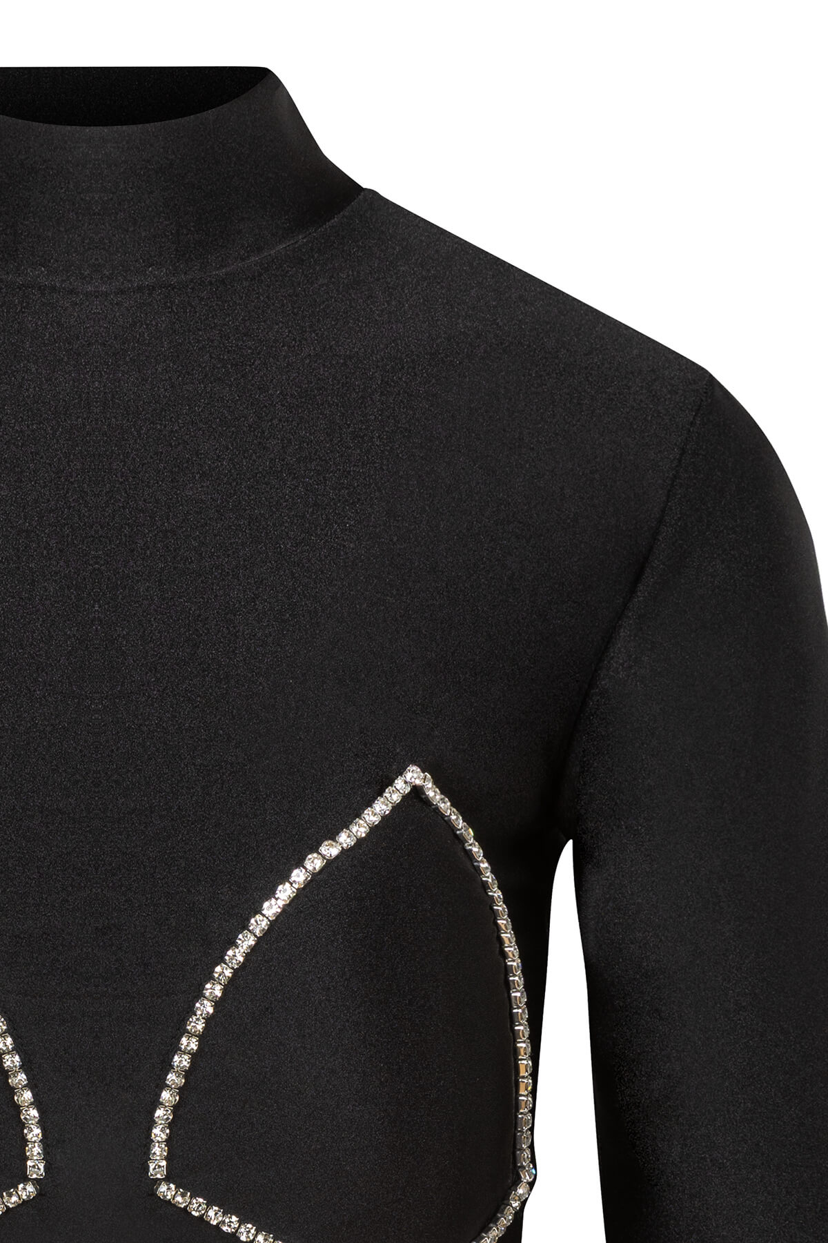 Midnight Crystal Top е символ на дръзката минималистична елегантност – прилепнал crop топ от черна еластична материя с деликатен металически блясък, чийто главен акцент е завладяващата кристална bra линия, която очертава женствения силует с искрящ прецизен детайл. Този изключителен модел доказва, че истинската провокация не се нуждае от излишък – само от един перфектен детайл. Двата триъгълни cup контура, очертани с непрекъсната нишка от сребристи кристали, създават визията на бижу, носено директно върху тялото – деликатен, но неустоимо завладяващ детайл, който привлича погледите с всяко движение. Контрастът между матово черната материя и искрящите кристали е умишлен и прецизен – минимализъм, издигнат до изкуство. Високата яка тип полуполо рамкира силуета с достойнство, докато дългите прилепнали ръкави подчертават линията на тялото с изтънченост. Прилепналата crop кройка завършва визията с безкомпромисна женственост – модел, който командва с присъствие без да повишава тон. Midnight Crystal Top е създаден за жената, която не се нуждае от думи, за да докаже своята власт – уверена, мистериозна и неустоимо привлекателна в своята тъмна изтънченост.