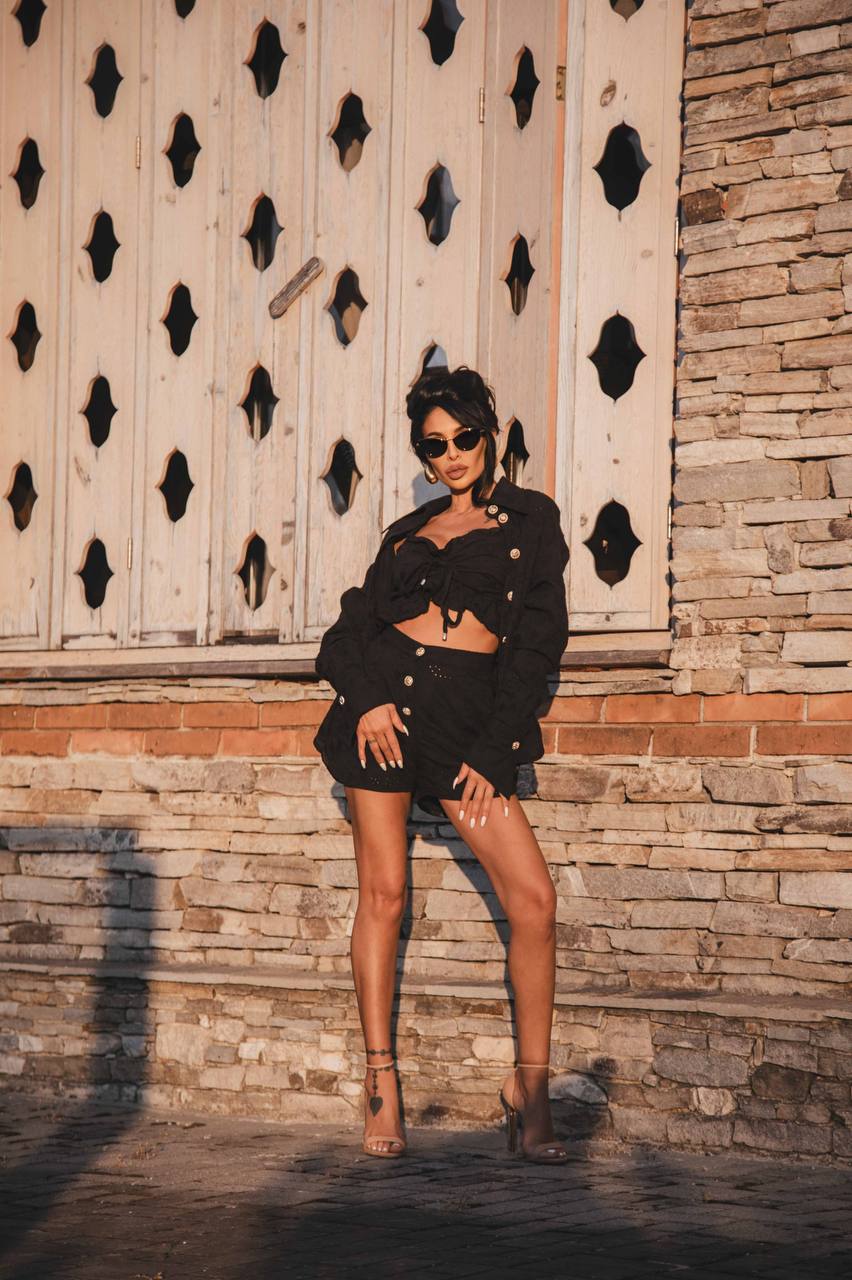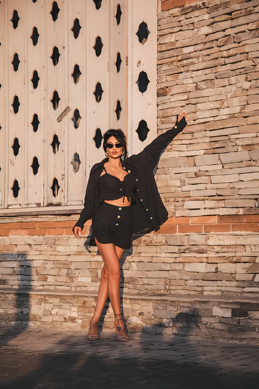 Сетът „Midnight Glam“ от серия „Ема“ е въплъщение на елегантност и изтънченост в черен цвят. Късите панталонки с копчета отпред подчертават женствеността и придават изящество на силуета. Късият топ с връзки и открити рамена добавя нотка сексапил и стил. За завършване на визията, сетът включва елегантна черна риза, която придава допълнителен чар и изисканост. Този комплект е перфектен избор за вечерни излизания или изключителни поводи, гарантирайки, че ще бъдете център на вниманието. Съчетайте го с изискани обувки и аксесоари, за да постигнете съвършенството на завършек.