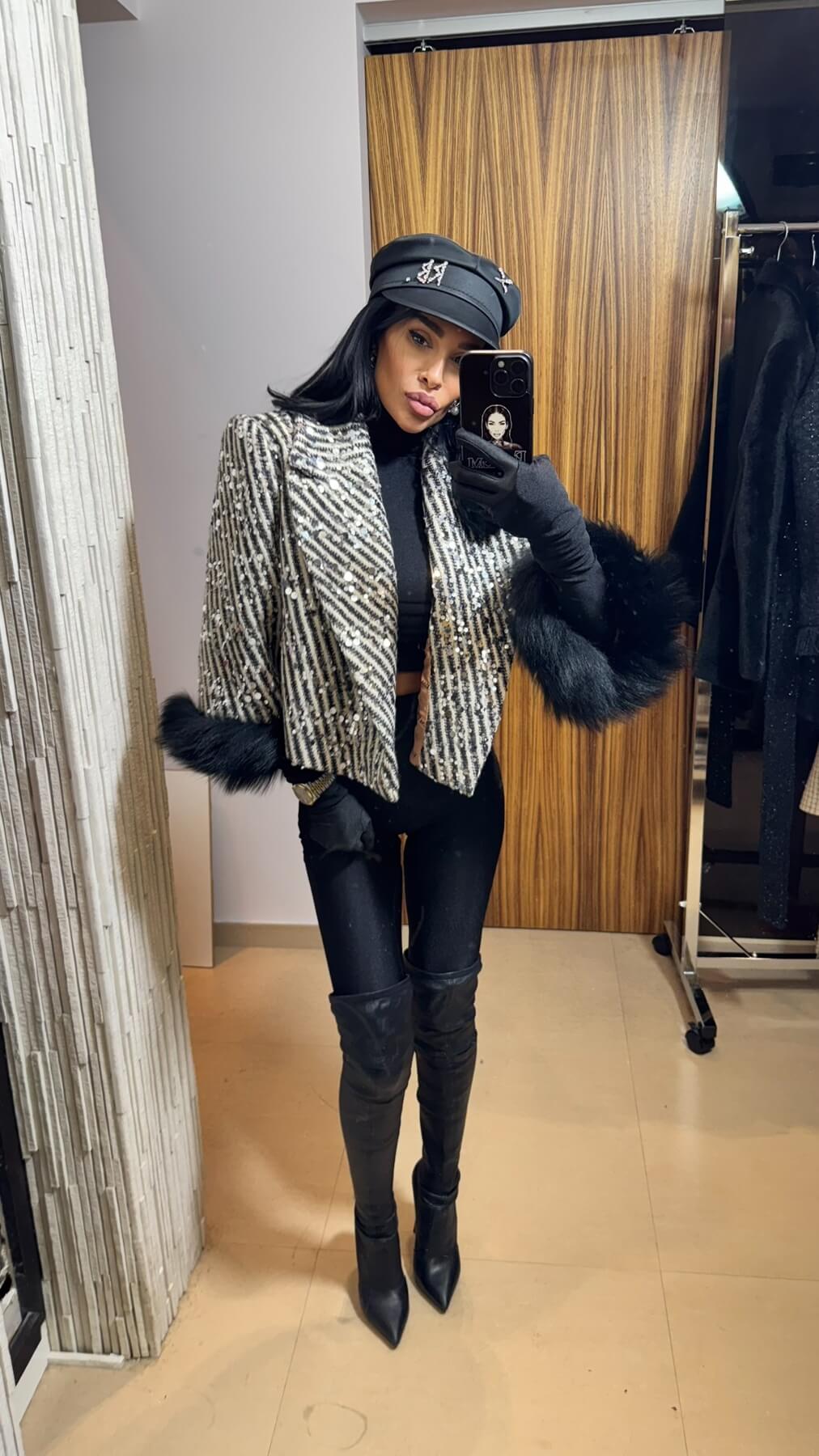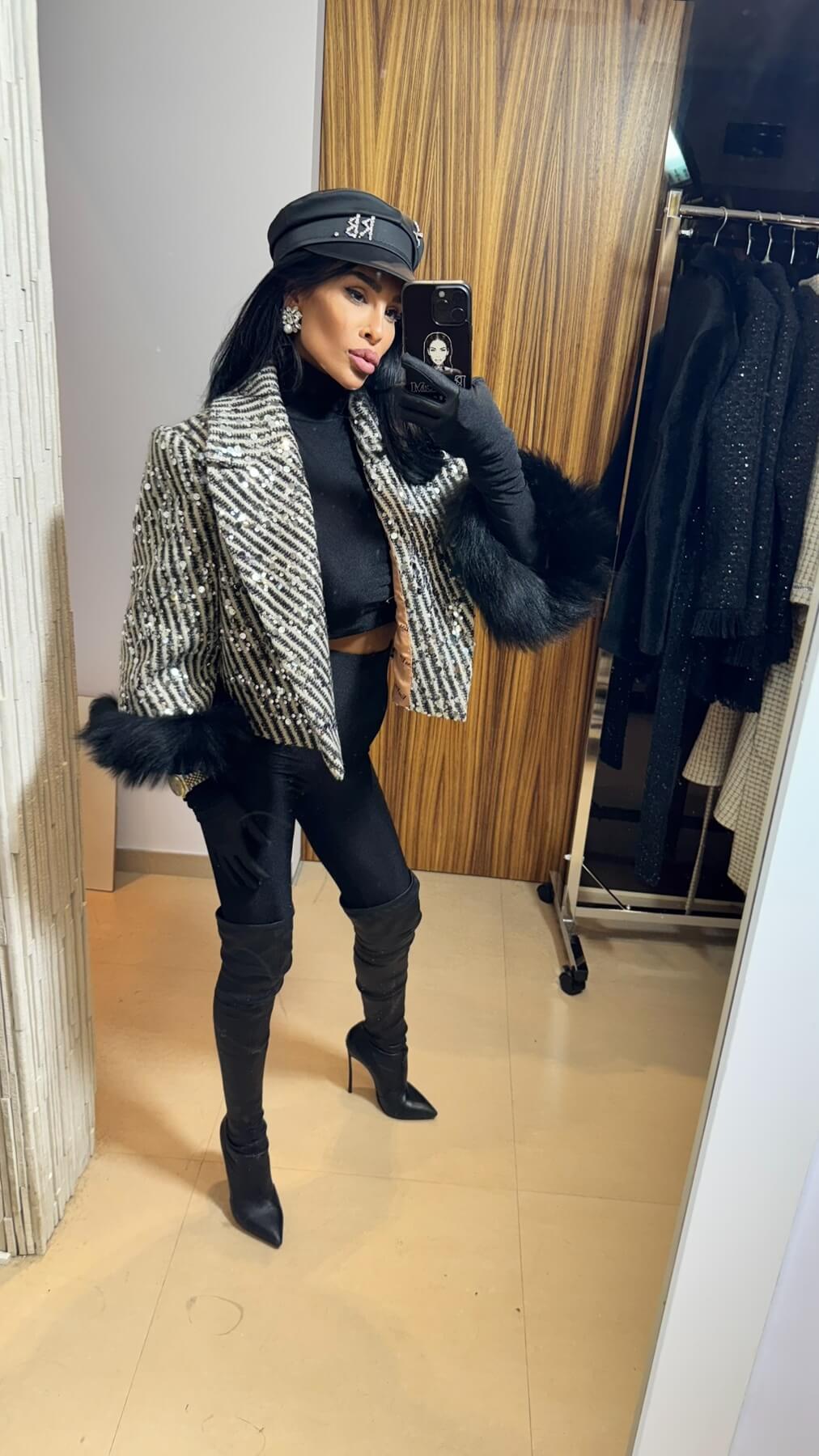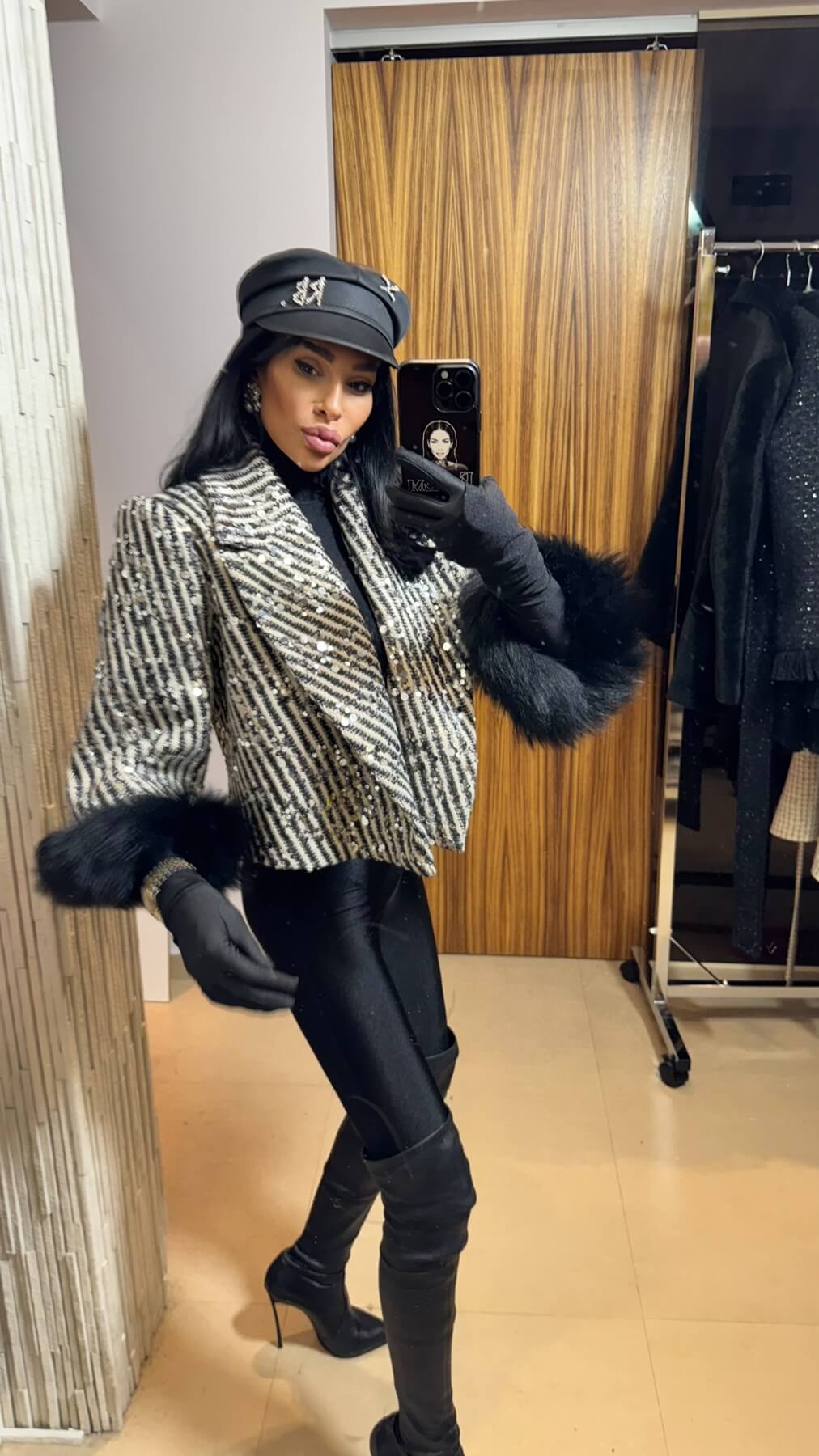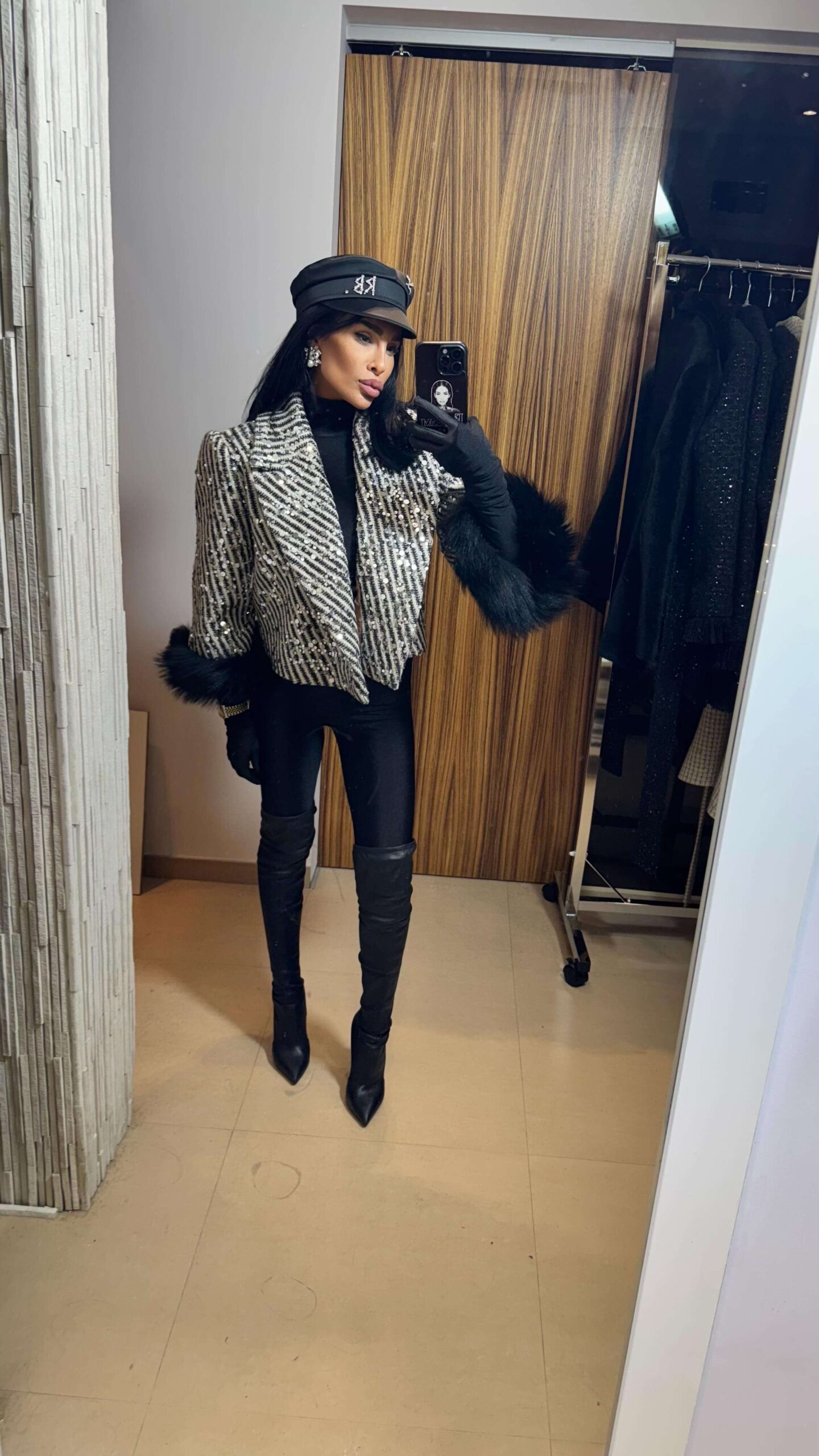 Конструкцията на модела е внимателно обмислена за максимален визуален ефект. Късата линия създава динамичен, млад силуet, който удължава краката и подчертава пропорциите. Diagonal pattern-ът на едрите сребърни пайети привлича погледите и създава усещане за движение дори когато сте неподвижни – това е истински statement piece, който трансформира всяка визия. Пухкавите маншети на ръкавите добавят неочакван luxury twist и тактилна мекота, създавайки завладяващ контраст между структурираното тяло и флуидните завършеци. Брандираният сатенен хастар осигурява гладко носене и добавя изненадващ луксозен детайл.