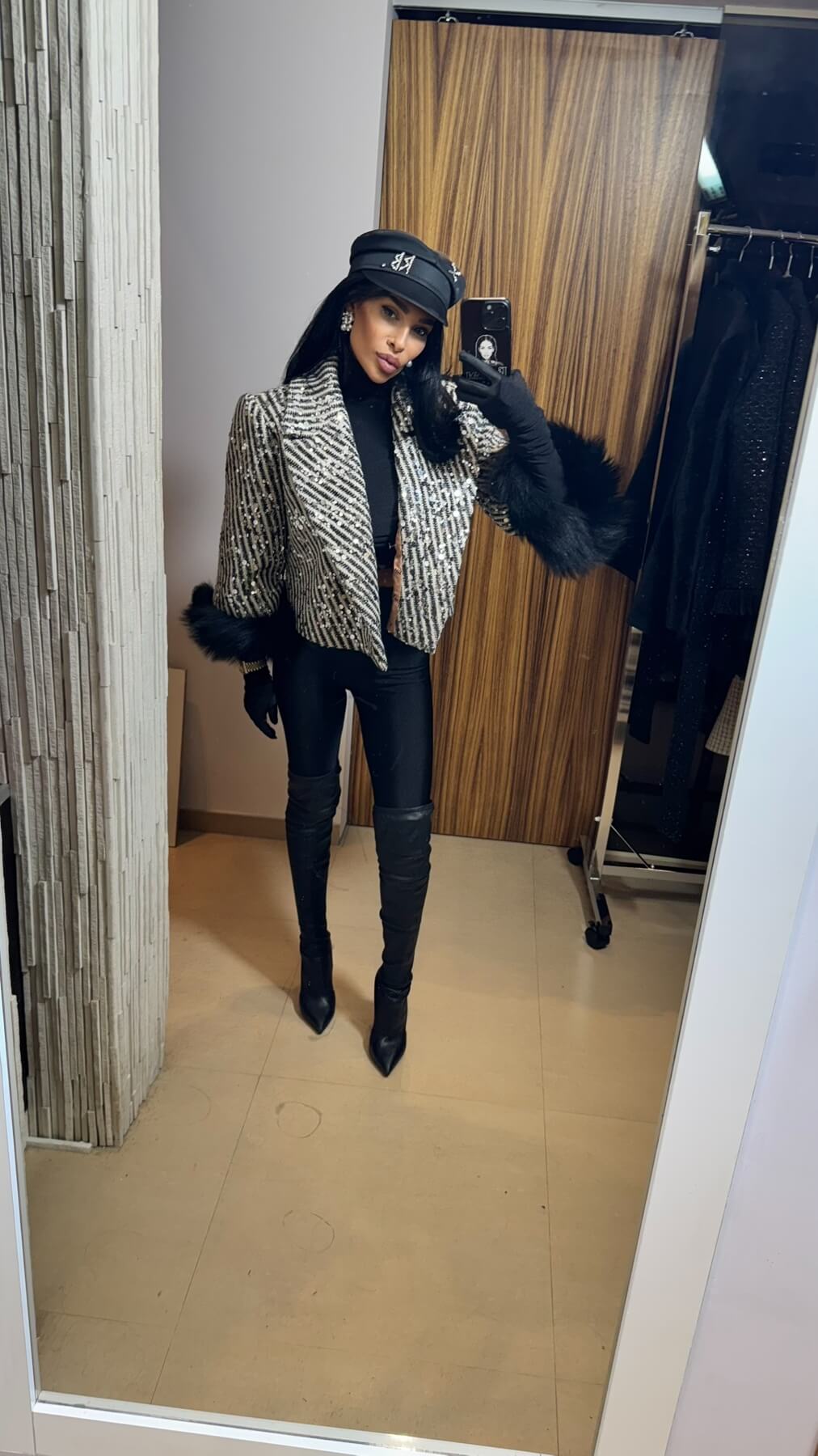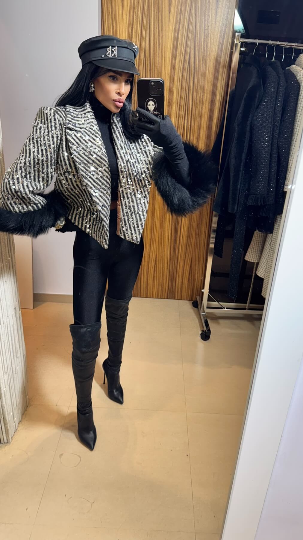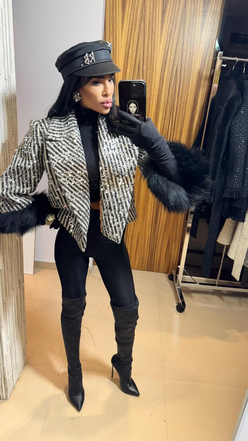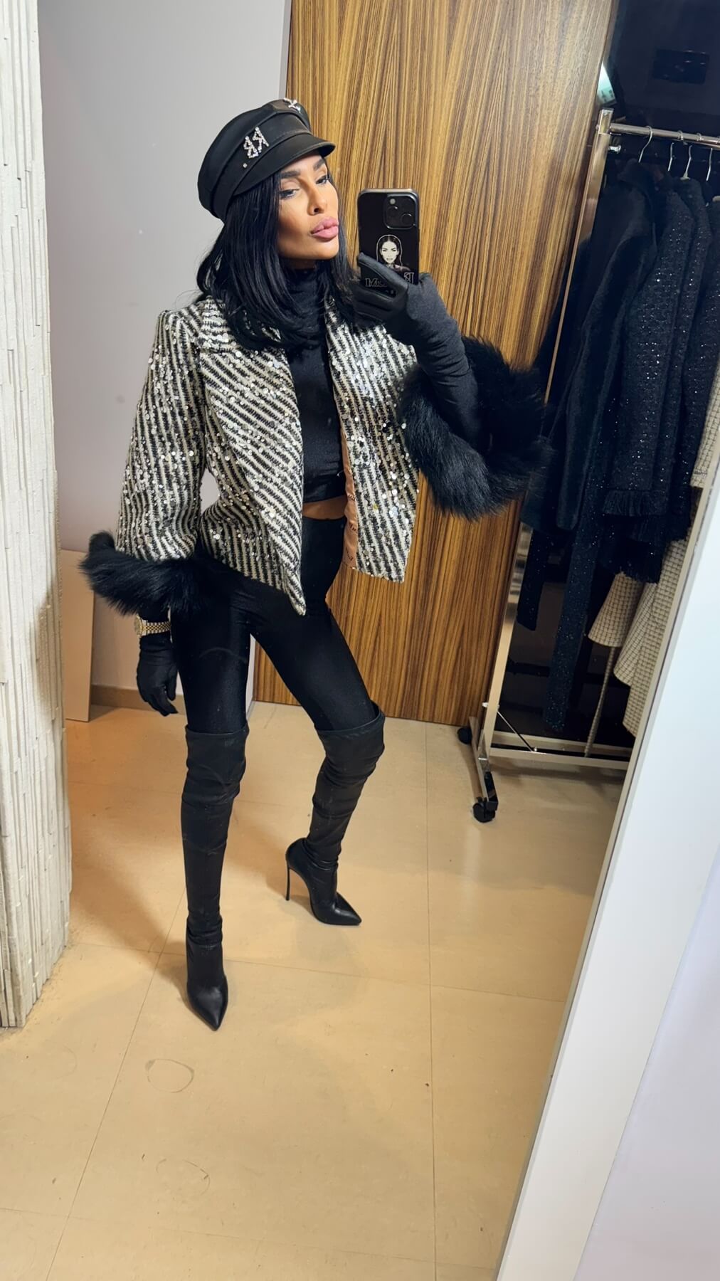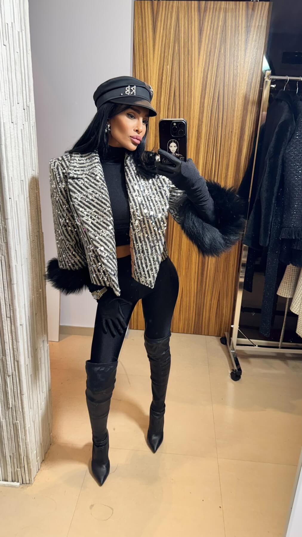 Конструкцията на модела е внимателно обмислена за максимален визуален ефект. Късата линия създава динамичен, млад силуet, който удължава краката и подчертава пропорциите. Diagonal pattern-ът на едрите сребърни пайети привлича погледите и създава усещане за движение дори когато сте неподвижни – това е истински statement piece, който трансформира всяка визия. Пухкавите маншети на ръкавите добавят неочакван luxury twist и тактилна мекота, създавайки завладяващ контраст между структурираното тяло и флуидните завършеци. Брандираният сатенен хастар осигурява гладко носене и добавя изненадващ луксозен детайл.