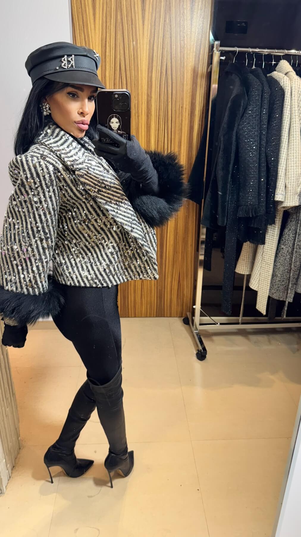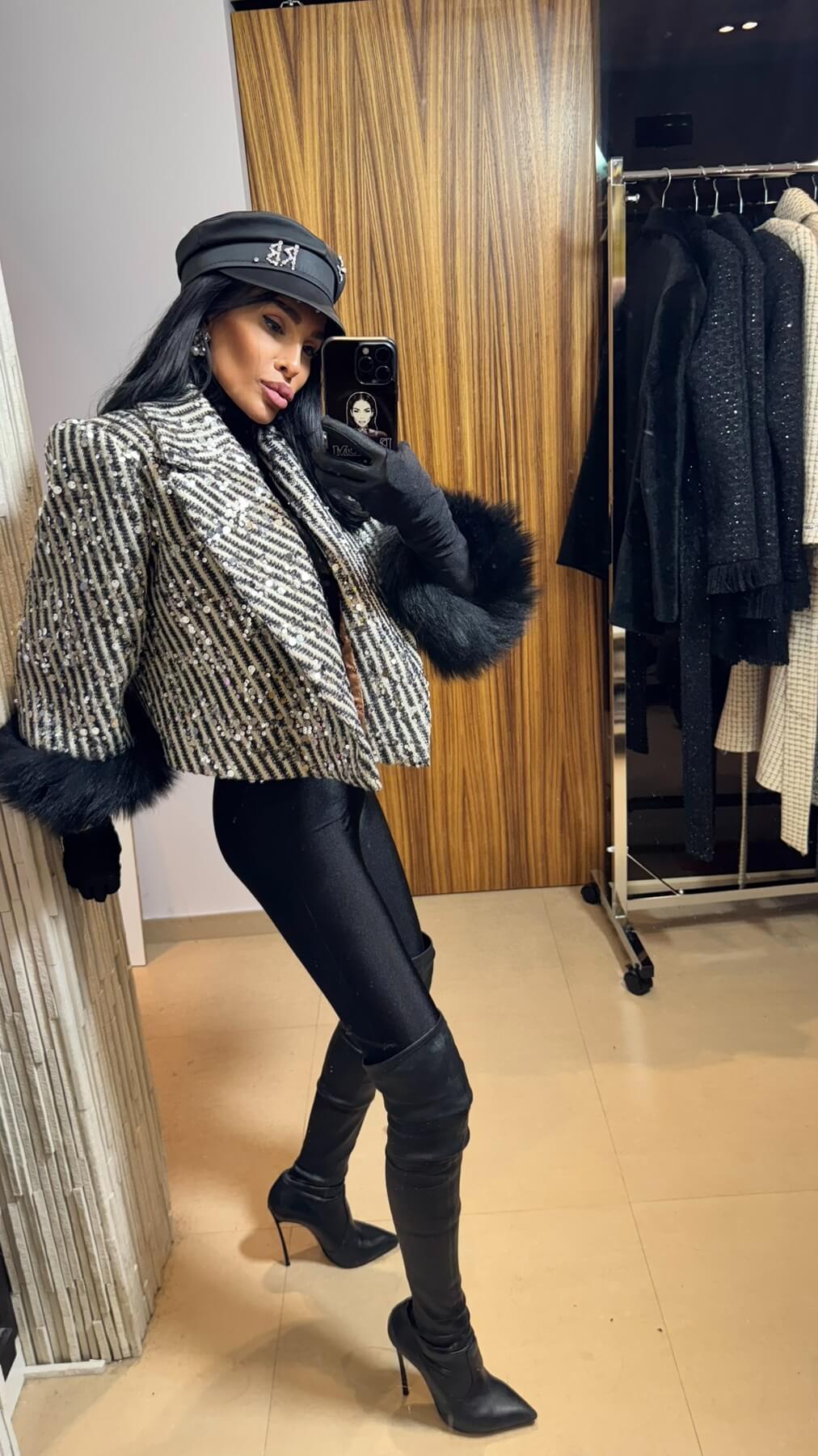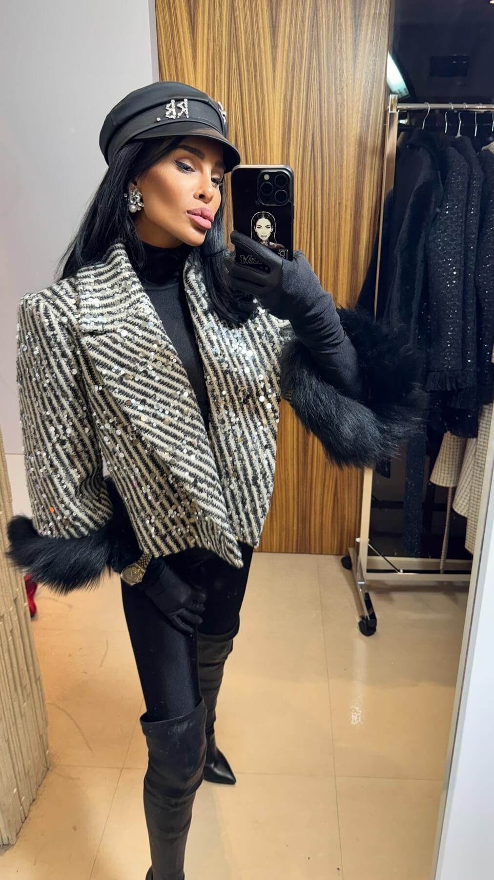 Pearl Luxe е истинско изявление на дръзката елегантност – изключително късо палто от 100% висококачествена вълна, декорирано с едри сребърни пайети в diagonal pattern и завършено с луксозни пухкави маншети. Този завладяващ модел съчетава класическата изтънченост на вълнения крой с блясъка на high fashion декорацията, създавайки визия на неустоима glamour и съвременна sophistication.