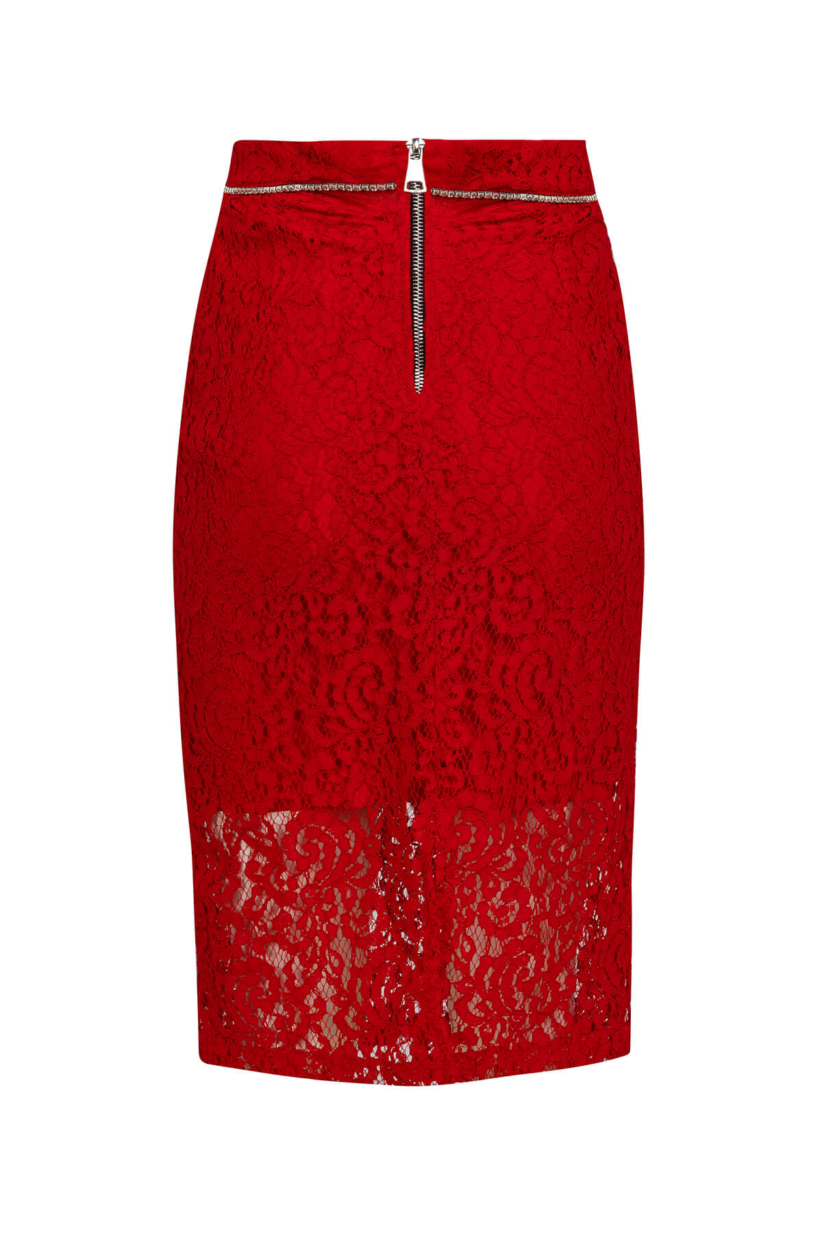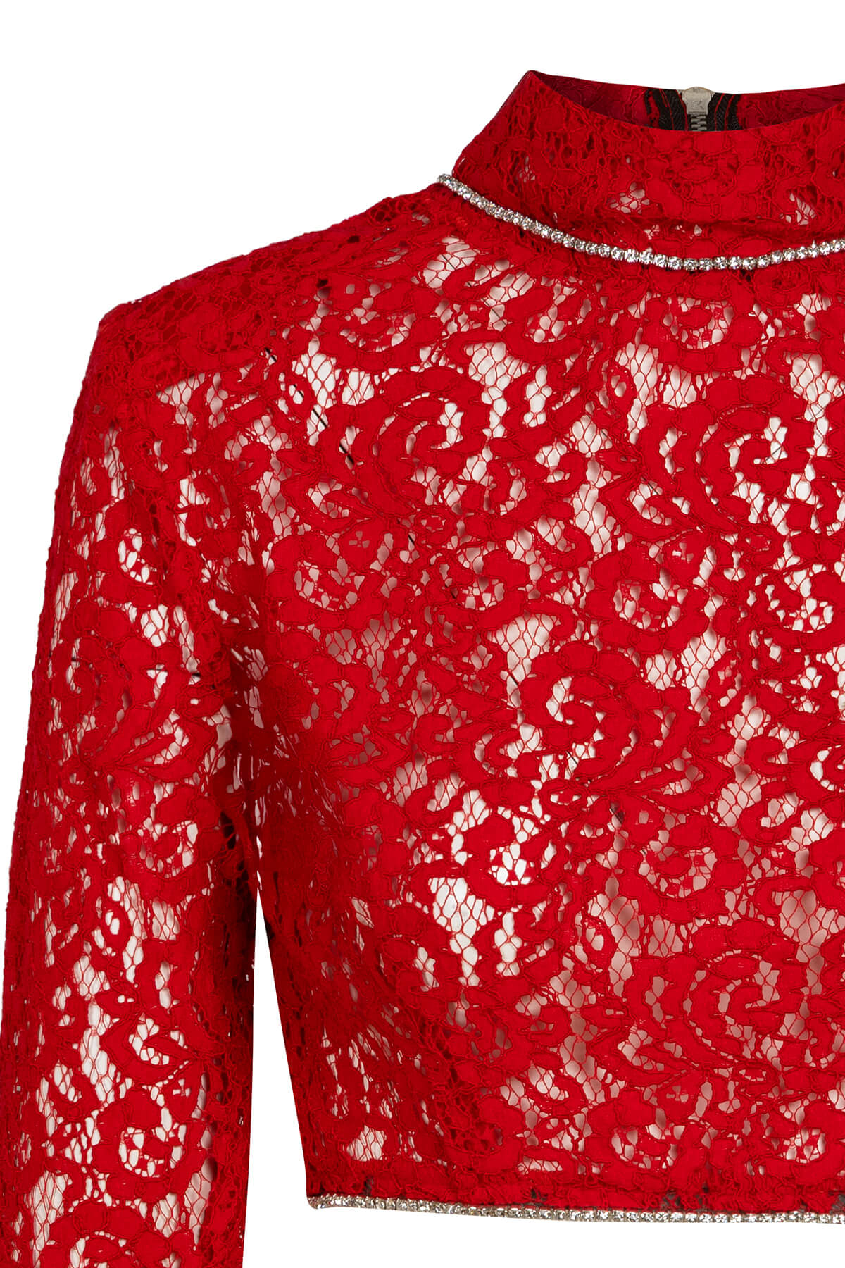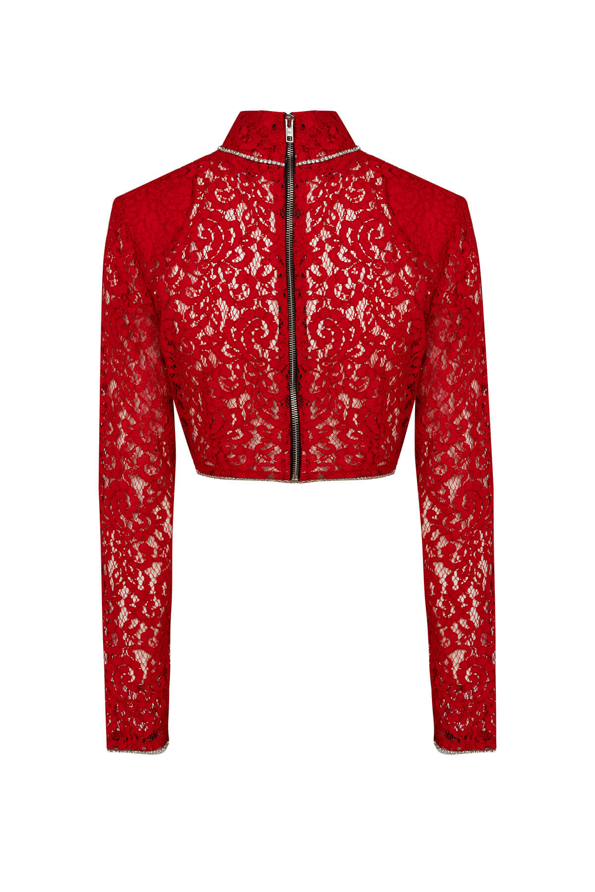 Red Desire Set е символ на страстната женственост и безкомпромисната елегантност – луксозен комплект от две части в наситено червено, изработен от изтънчена дантела с богат флорален мотив върху nude подплата. Този завладяващ модел съчетава дръзката чувственост на червеното с деликатността на дантелата, създавайки визия, която не оставя никого безразличен. Кроп топът е прецизно конструиран с висока яка тип стойка, която рамкира силуета с достойнство и интрига. Кристалната лента, която очертава яката и завършва маншетите на дългите ръкави, добавя искрящ лукс към всяко движение. Прилепналата кройка подчертава талията, докато ципът на гърба завършва детайла с модерна нотка. Midi молив полата продължава историята на комплекта с безупречна последователност – горната част е подплатена за структура и уверена посадка, докато долната се разкрива в прозрачна дантела, която интригува и завладява. Кристалната лента по талията свързва двата елемента в единна, хармонична визия от лукс и желание. Red Desire Set е създаден за жената, която не се извинява за това, че е забележителна – уверена, завладяваща и неустоимо привлекателна във своята женствена сила. Тя не търси погледи, тя ги получава естествено.
