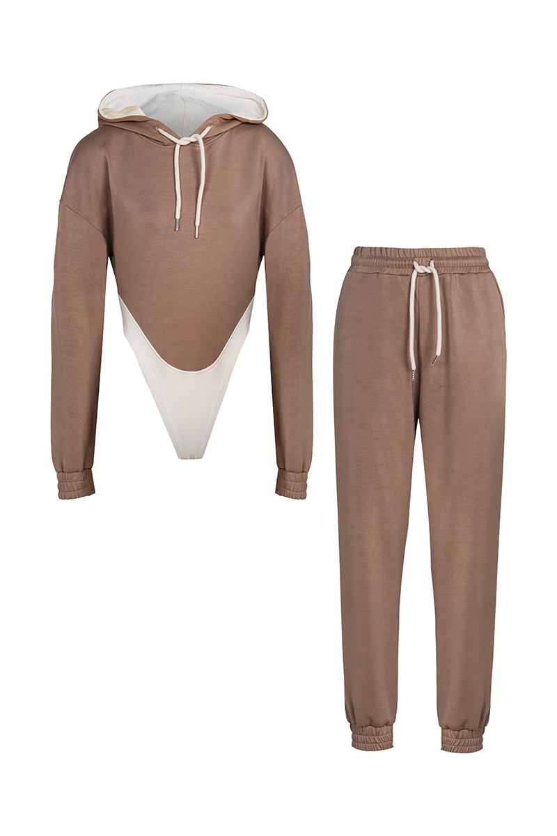 Комплект от две части (горна и долна), съчетаващ комфорт и модерна визия. Свободен анцуг за максимална лекота и удобство, комбиниран със стилен суитшърт / боди, който придават завършен вид. Перфектният баланс между непринуденост и елегантен стил – за динамични дни на всяка една от вас.