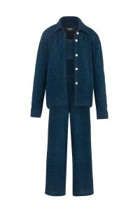 Луксозен дамски комплект от три части от емблематичната колекция на Eм Ем Collection. Пухкав, мек и невероятно топъл, този сет ще ви осигури максимален комфорт през студените дни. Изработен от висококачествени материали и украсен с елегантни перли, той е перфектното допълнение към зимния ви гардероб